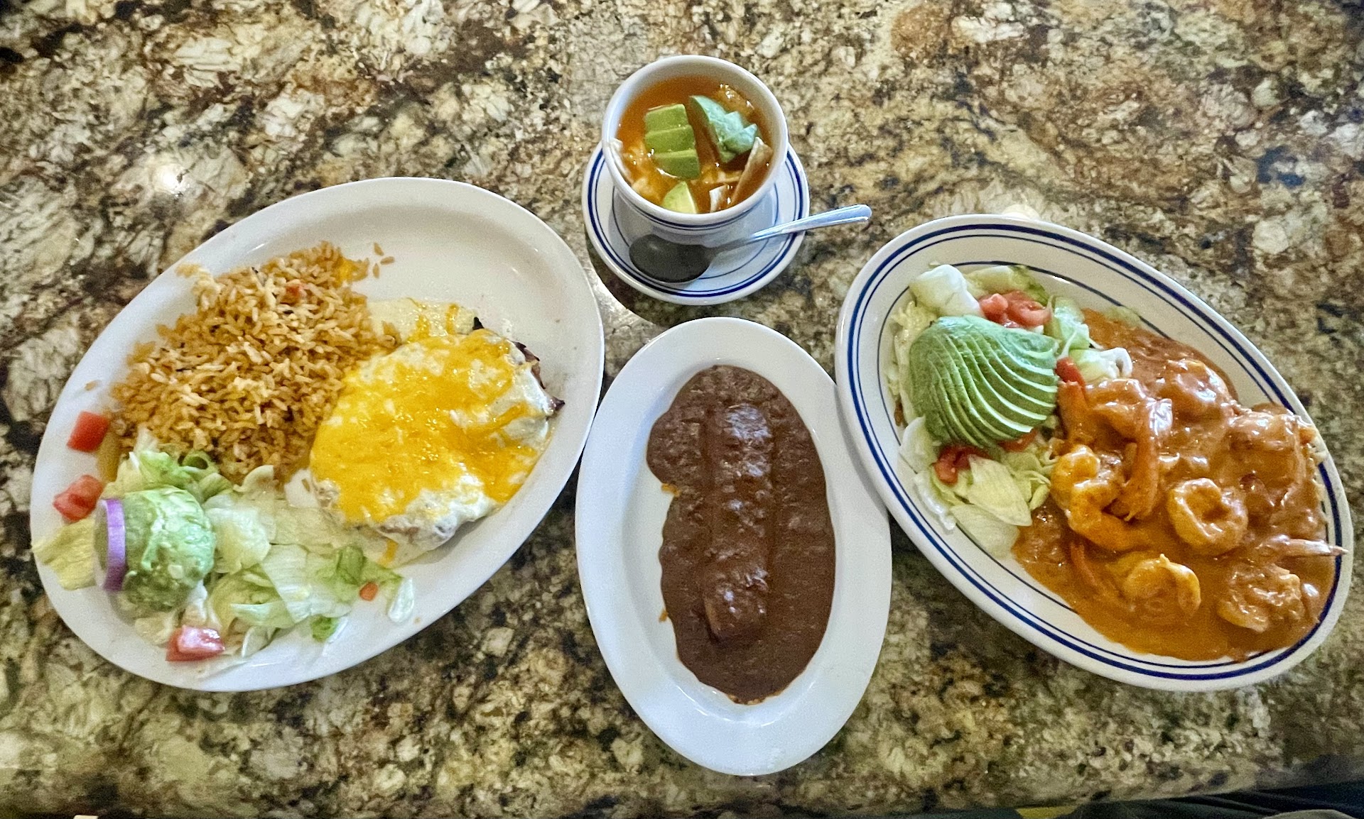 When the enchiladas were brought to the table, their chili con carne sauce was almost black in color from a too-heavy hand with the chili powder. Black enchiladas? There was no finesse at all in evidence. And my friend's plate had no rice or beans served with his enchiladas. When he asked about this, the waiter said that his order didn't include them. A second look at the menu showed that the "Comida" (dinner) section of enchilada dinner choices seemed to have a totally random assignment of rice and beans inclusions or exclusions. Why wouldn't each of these enchilada dinners include rice and beans?!