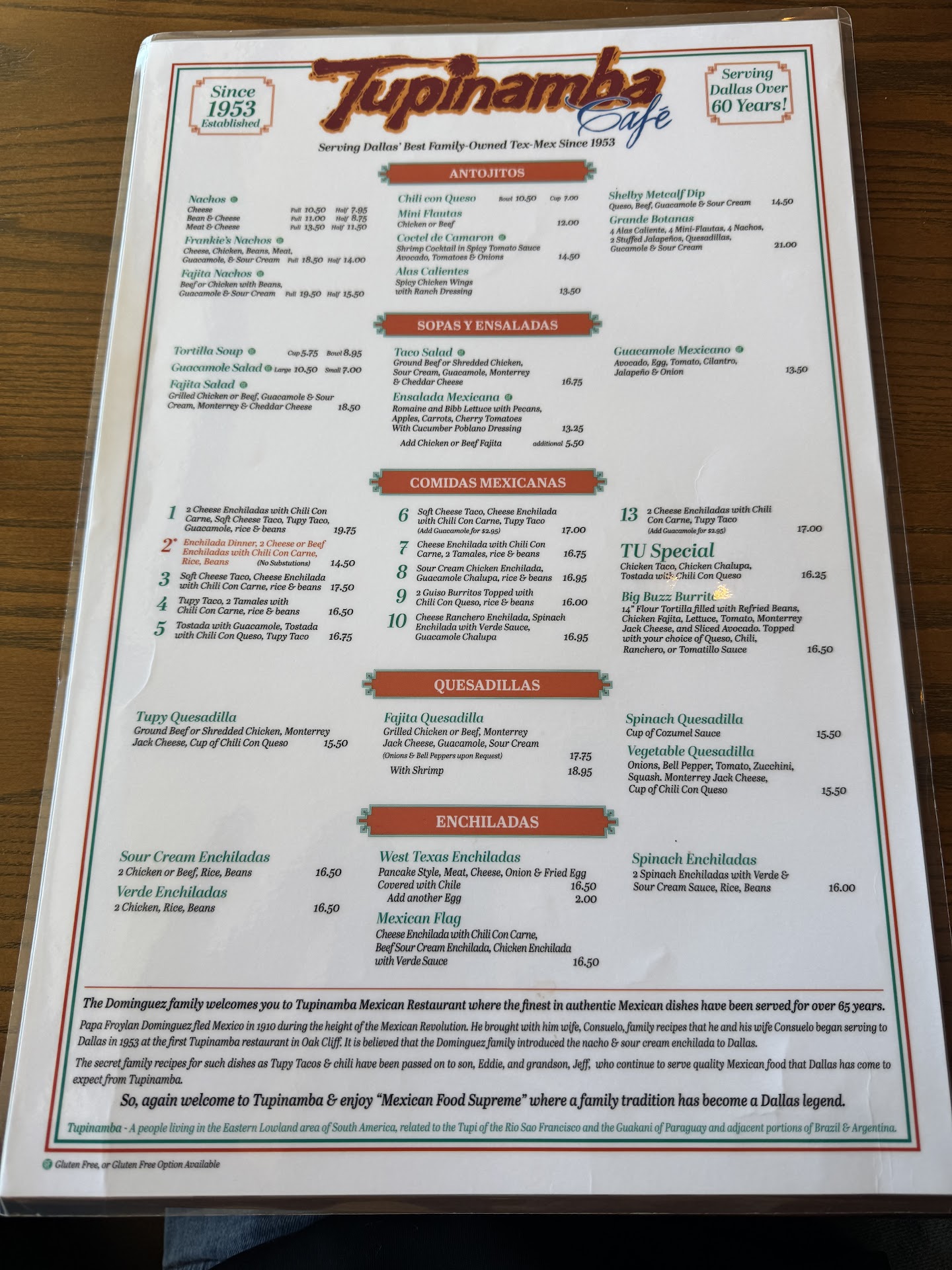 Like most restaurants, after patronizing them for years, I've gotten to know the menu well. Today I had a #1, which includes a Tupy taco, and many other Tex-Mex favorites. Rather than rice and beans I'll usually substitute for papas Mexicana (Mexican potato's) which are sliced newt potato's pan fried with jalapenos and onions...they're great and I'm not sure everyone knows about them because they don't come with every dish. This can be seen in the picture. They really go well with just about anything and are great on their own.