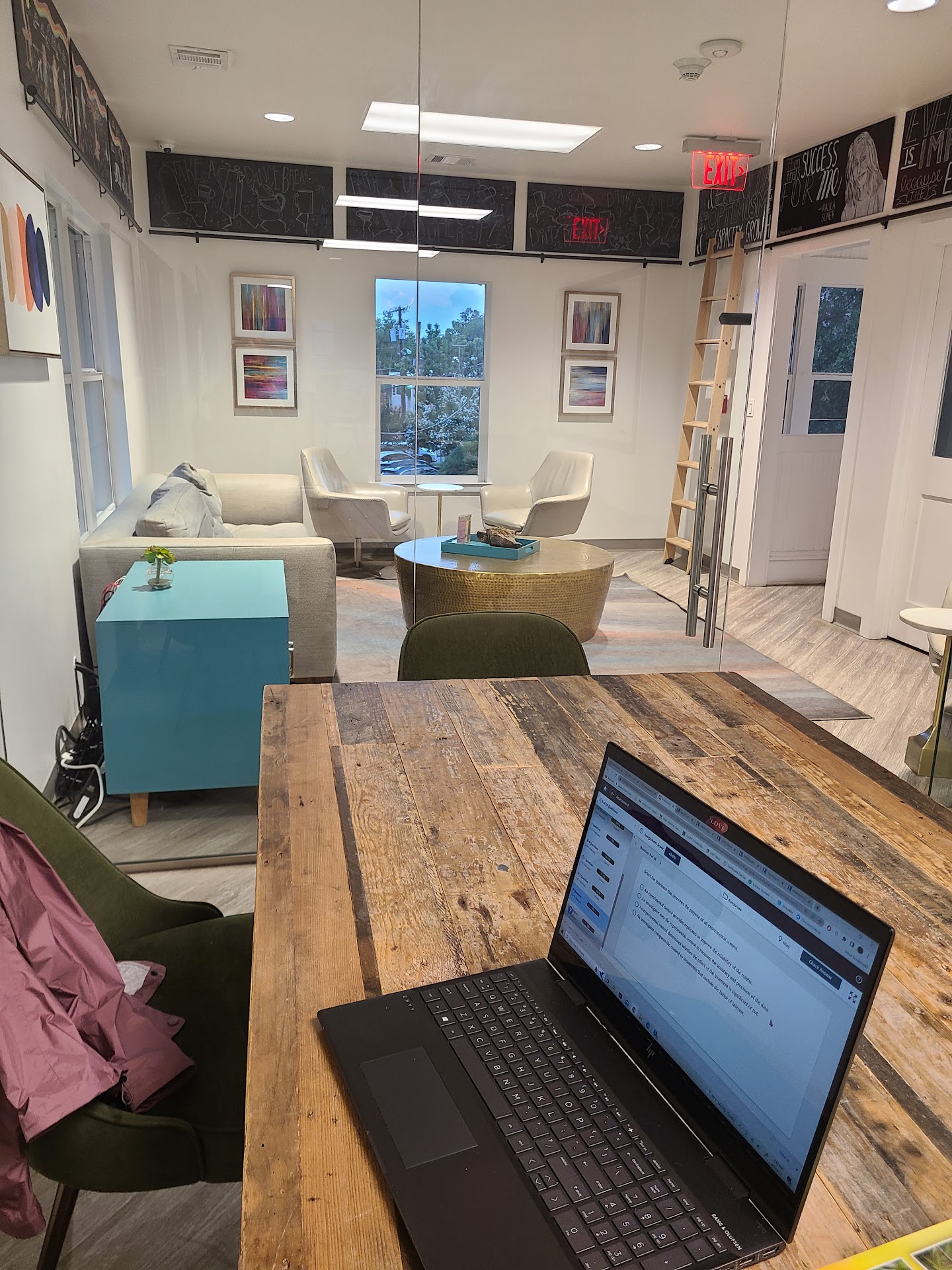 Atmosphere: ⚪️🔵🟤bright, white space with teal and brown accents. Clear support of Pride 🌈and community events, lots of windows to let in natural light
