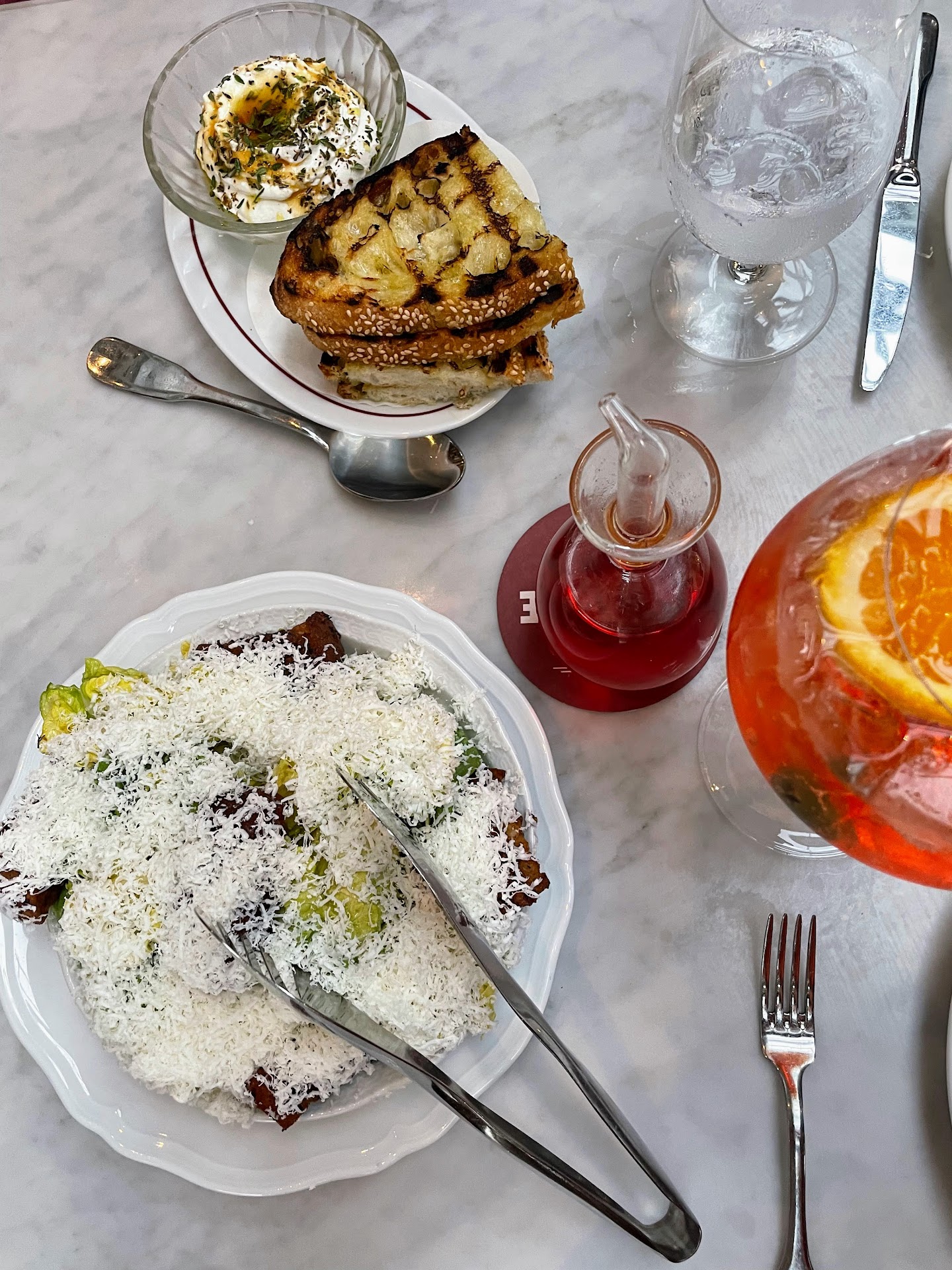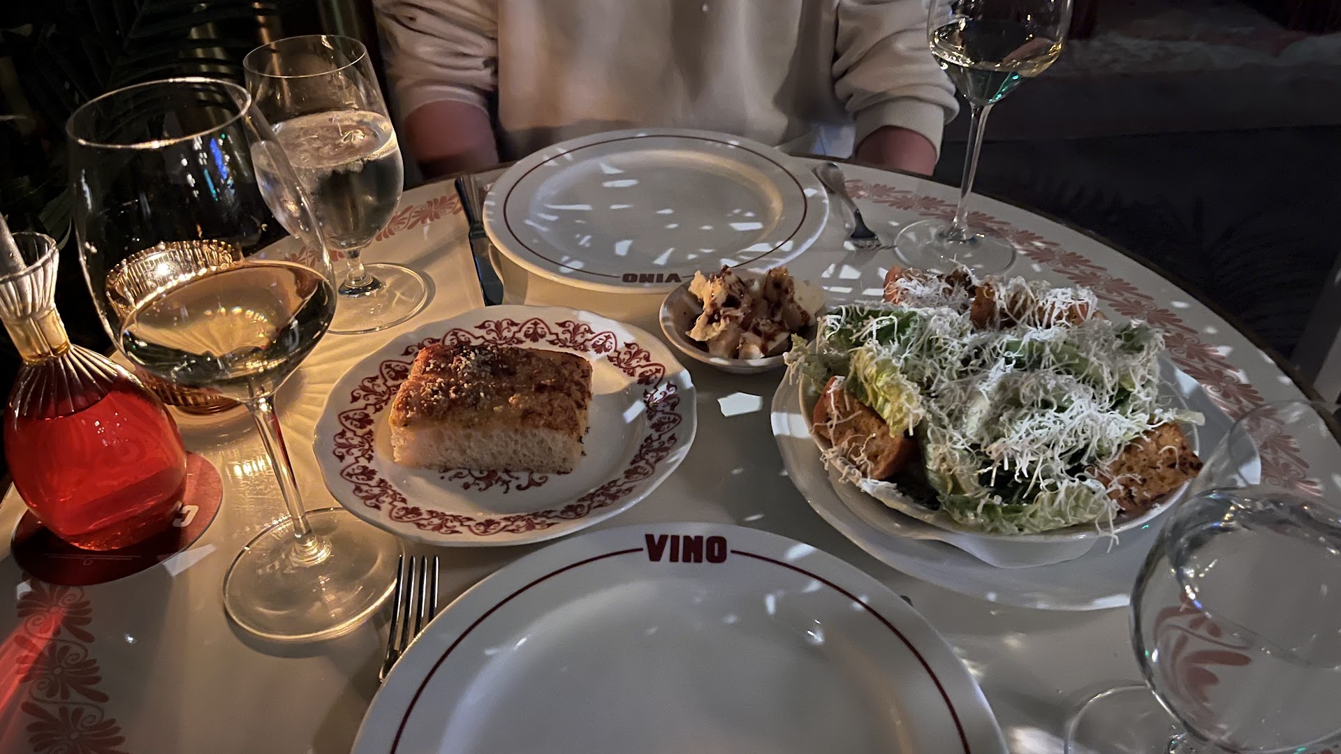 The four of us were finally seated and were delivered some olives and chunks of parmesan drizzled with balsamic. The balsamic ended up on the table as the server had a heavy hand and no one thought to clean it up. Our olive pits adorned our large plates as there were no smaller bread plates on which to place said pits. I looked through the wine menu... very very expensive and I am not one to usually suffer from sticker shock. I finally found a bottle at a reasonable price and was pleased with the choice.