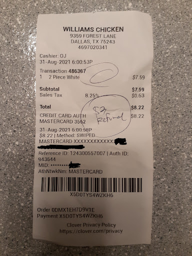 Sunday drive thru. We do not have a Williams Chicken where we moved to. We were out of town and passing by decided to stop. The chicken and corn fritters and fries were fresh. Fries no flavor!!! The mash potatoes had an odd bad flavor. The main problem was how they charge us. I ordered 20pc mix, think it was 36.99 I asked if it came with 2 sides. She said yes and X amount rolls. I ordered 4 total sides. When I looked at he reciept she charged the 20pc and 4 individual sides plus jalapeƱos. I went in and asked why she charged me for the 2 sides. She explains now that I owe her more money. The combo with 3 sides is 59.99 plus the 1 more side. I explained I do not owe anything due to her charging me for the 4 sides already. Went back and forth. She just said never mind to me owning them but they don't owe me. As she walked to the front I was trying to get my food. She persisted to take it to my husband waiting in the car who is driving.... why give it to him? I need to put it where I want. Get home, which is an hour away and do not have our jalepenos. Not sure if they was an accident or they earned their couple bucks back that I was not paying. Will not be back. Disappointed!!!! There is location in Dallas that we absolutely loved. Was looking forward to some Willams Chicken. Spent 68 dollars and some change...