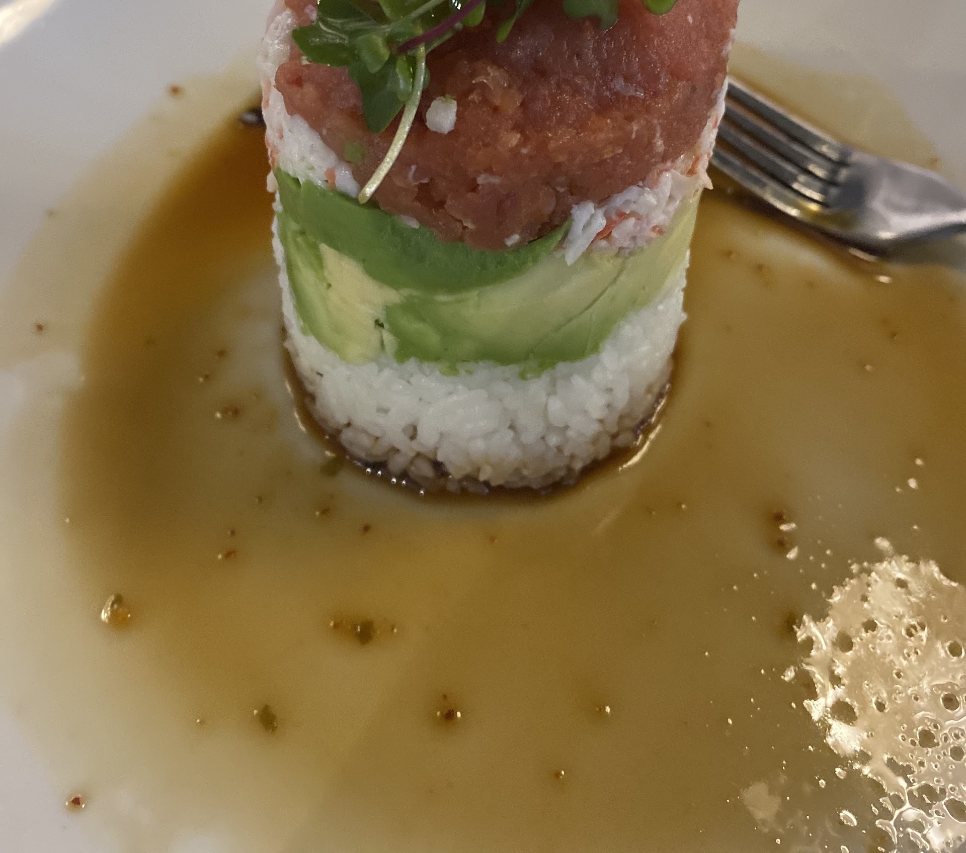 Wife ordered a salad and I ordered Suimono Soup for appetizers as well as an Ahi Tower and received them 30 minutes later. Appetizers were decent. Ahi Tower was quite small compared to most places we frequent and dry.