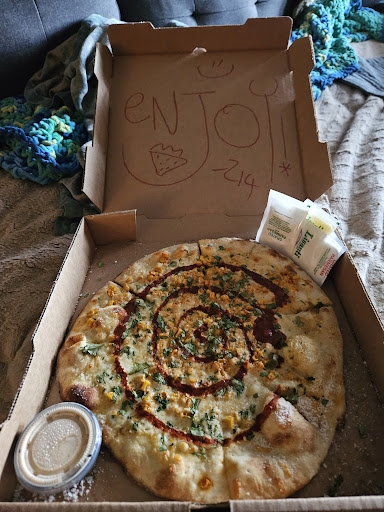 she did, however, take 60 seconds out of her day to draw something on the inner lid that made me smile when I finally got home. this doctor sending me to this lab just broke some rough news, and if I'm honest, the bit of human connection she gave me in this medical whirlwind I'm in, it was just.. one of those unexpected moments in life that turn out to be more fulfilling than you expected. it was just a pizza, but between the service and the product, it made me feel as if some small part of the world was put right for a few hours.
