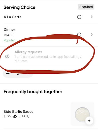 Ordered through Uber and as you can see from the picture, you can't leave allergy requests in app so I called (see photo for time stamp) and asked if they could accommodate. Was told they could make one accommodation for an allergy so I thought all was good. If they had said they couldn't do anything for me, I would have moved on no hard feelings. In hindsight, I wish they had just done that instead of wasting my time.