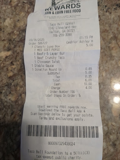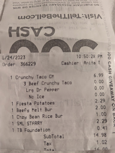 Read moreFood was nothing like it used to be. It had a okay taste but the filling were alot less than what they used to be. The Dorito shell taco , I had to search for the meat, very little, maybe a teaspoon of meat spread across bottom of shell. Shell was so soggy that it just fell all to pieces. The Crunchwrap Supreme was mostly Shell with very little filling. Pulled Shell away to see what was inside there was maybe 2 tablespoons of meat, lettuce, tomato and cheese combined, very little. I was a little disappointed, it had been a while since I had gone to taco bell, and this was a splurge night for me and my family of diabetics. If I wanted basically empty shells, I could have gotten that at home. No where worth the $21.40, that we paid for our meals. The Pepsi I got, was nothing but syrup, very little fizz. Quite gross to be honest with you. Probably won't go back any time soon. The were nearly out of sauces. The cashier was nice, and the order was correct. That is basically the only good thing I have to say about...