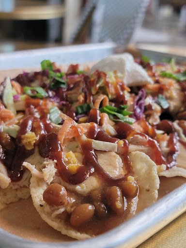 I just recently found out about this place inside of a old factory refurbished into a modern chic decor shopping complex. As you can see from the pictures of the outside building it has some great personality. This is not a review on the building so let's get to it. As I walk in from the outside parking lot looking at the landscapes and old block foundations I knew it would be different. I walk through the outside doors to find this bbq place directly on my left. It had cool green plants that gave a calming feeling as I looked forward to see gold tables and chairs. I turn around the corner to see a new nicely decorated shop with great smells of food coming out. I went up to order to be greeted by a young staff with a smile. I asked my first line at every restaurant I go too. "What do you have that is gluten free on the menu?" She paused for a second and replied everything but the Mac & cheese and the buns are not either. I looked at the menu and saw the bbq chicken Nachos. 😍 I decided to order this and asked for cole slaw, baked beans, and green chives. I also got a sprint to drink. I waiting in the main corridor of the building just outside the shop for my food. There were a few tables, couches, and even a movie 🎥 screen that people watch the games on at times. I also found out they have live music 🎶 in the evenings too. I waited only a few minutes till the food came out. As you can see from the pictures 📷 wow it looks amazing and yes it was just what I was looking for bbq chicken Nachos. They bbq sauce was very flavorful, chicken tender moist, the beans and Coleslaw took the flavor over the top and 😋 delicious. I spoke with the owner who brought out my food he was very passionate about his business. As he was explaining the process he makes his bbq brought back memories of how it should be done growing up in Texas. It should be slowly cooked for 14 hours adding flavor. If you are looking for cheap low quality food like fast food this is not the place. He buys top quality food and prepares it for hours just so I can have this mouth watering bbq chicken done right. I greatly appreciate a business that is dedicated to high quality food. As far as the price I thought it was very reasonable and would pay more for this kind of quality. I saw a few comments about price and you can't compare fast food prices to top quality food. It's like comparing apples and onions you get what you pay for. For me I would gladly pay higher fees for top quality food like this hands down. I would highly recommend this place, the atmosphere, and food. Stop in you won't be disappointed. Also, they are getting gluten free buns for all of those out there that have a gluten allergy. 🤗
