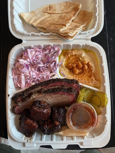 Finally, the Lebanese BBQ bowl: rice, lettuce, pickles, pickled turnips, hummus, pita chips, tzatziki, and a healthy heap of brisket. It’s a flavor bomb. A Texa-bibi mezze miracle.