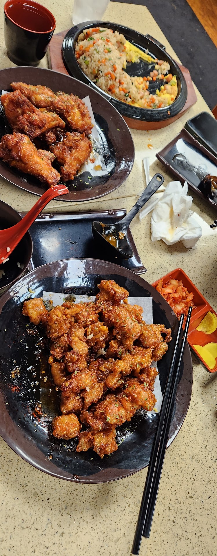 2025 update. The fried chicken is still great at Chick & Jajang. The owner is a good guy. I once saw him give a free meal to a homeless man. This time I had their soy & garlic fried chicken $18, (7 pieces) and Korean fried rice $17. The fried rice was served on a bed of egg on top of a cast iron plate. This was a beautiful dish. Too bad the egg is dry because of the cast iron plate and the rice was a bit bland. It needed some Chinese white pepper but it wasn't available. They did have this red pepper shaker at the table.