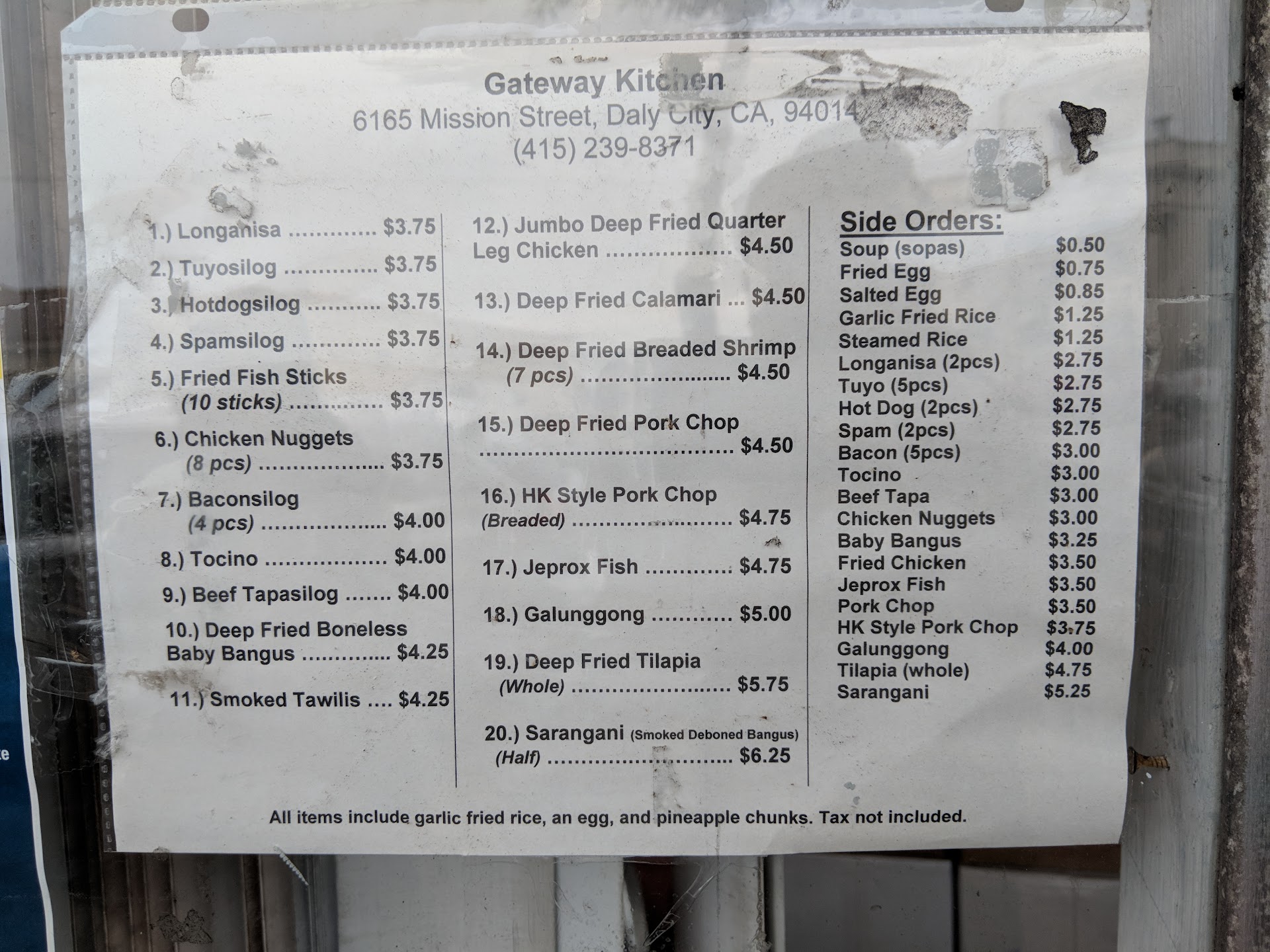 Read moreI stopped by Gateway Kitchen to get something to-go a couple of days ago while passing through Daly City. It is located on Mission which like every other street in Daly City has almost zero parking so your best bet is to park in the lot at Mission & Bepler and walk. During the peak lunch hour, it seemed to be about half full. After going through the menu I decided to get the Beef Tapsilog ($3.45) to-go. What immediately struck me was this was literally dirt cheap so I was a little skeptical about the quality. After ordering I was out in less than 2 minutes which means nothing was made fresh.
