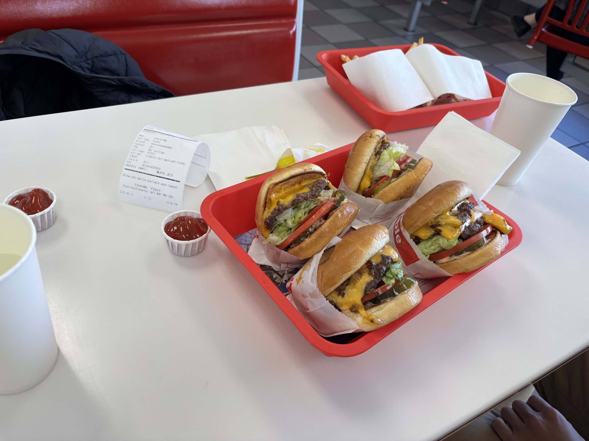 I've often heard the argument that its competitive on price and while it's certainly cheaper than those peers, the gap is closing. 22 bucks for a 2x double doubles w/ onion, fries and 2 shakes. For the same price at mcdonalds you can get 40 nuggets, a cheeseburger, a chicken sandwich, drinks and 4 pies.