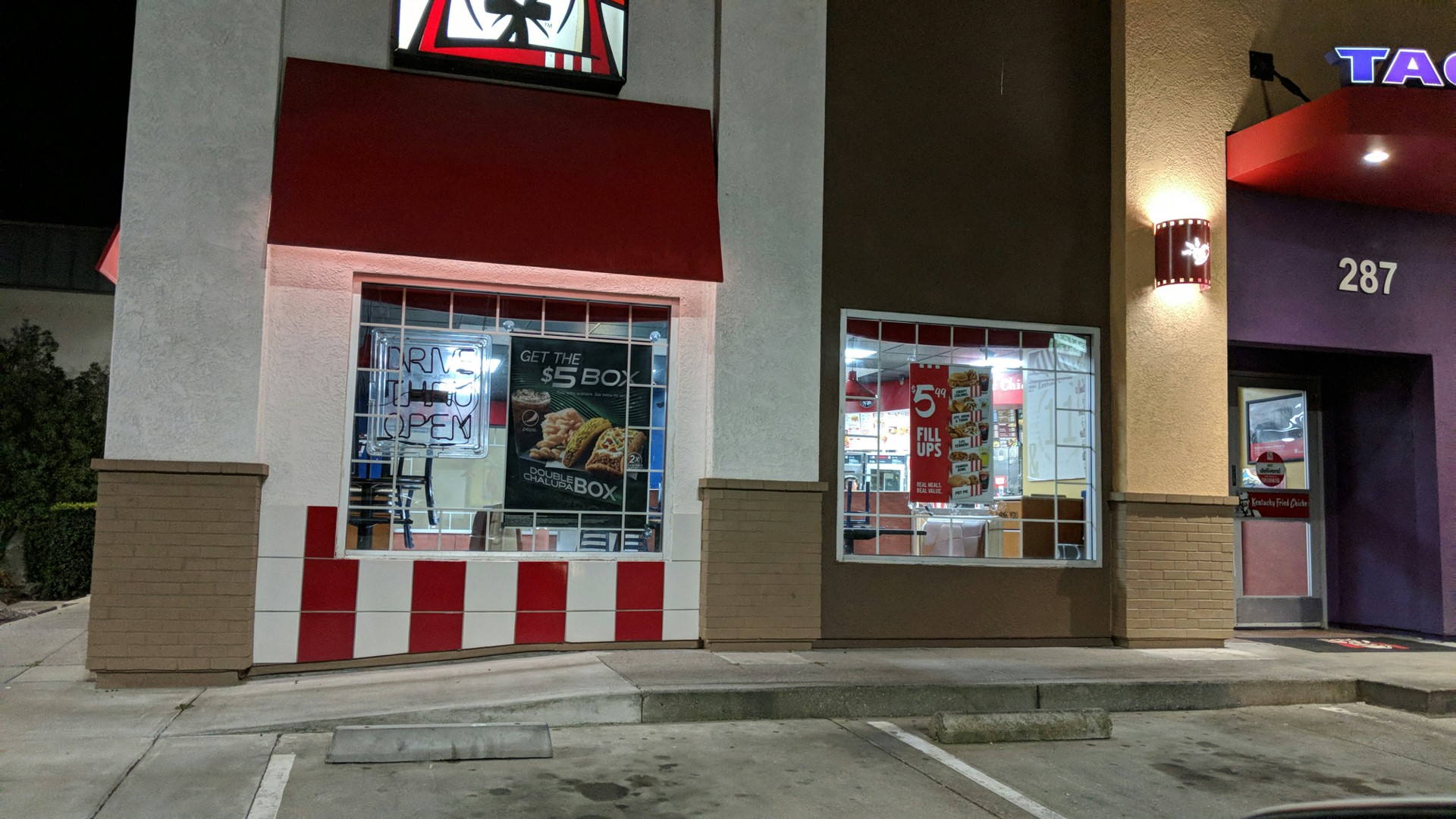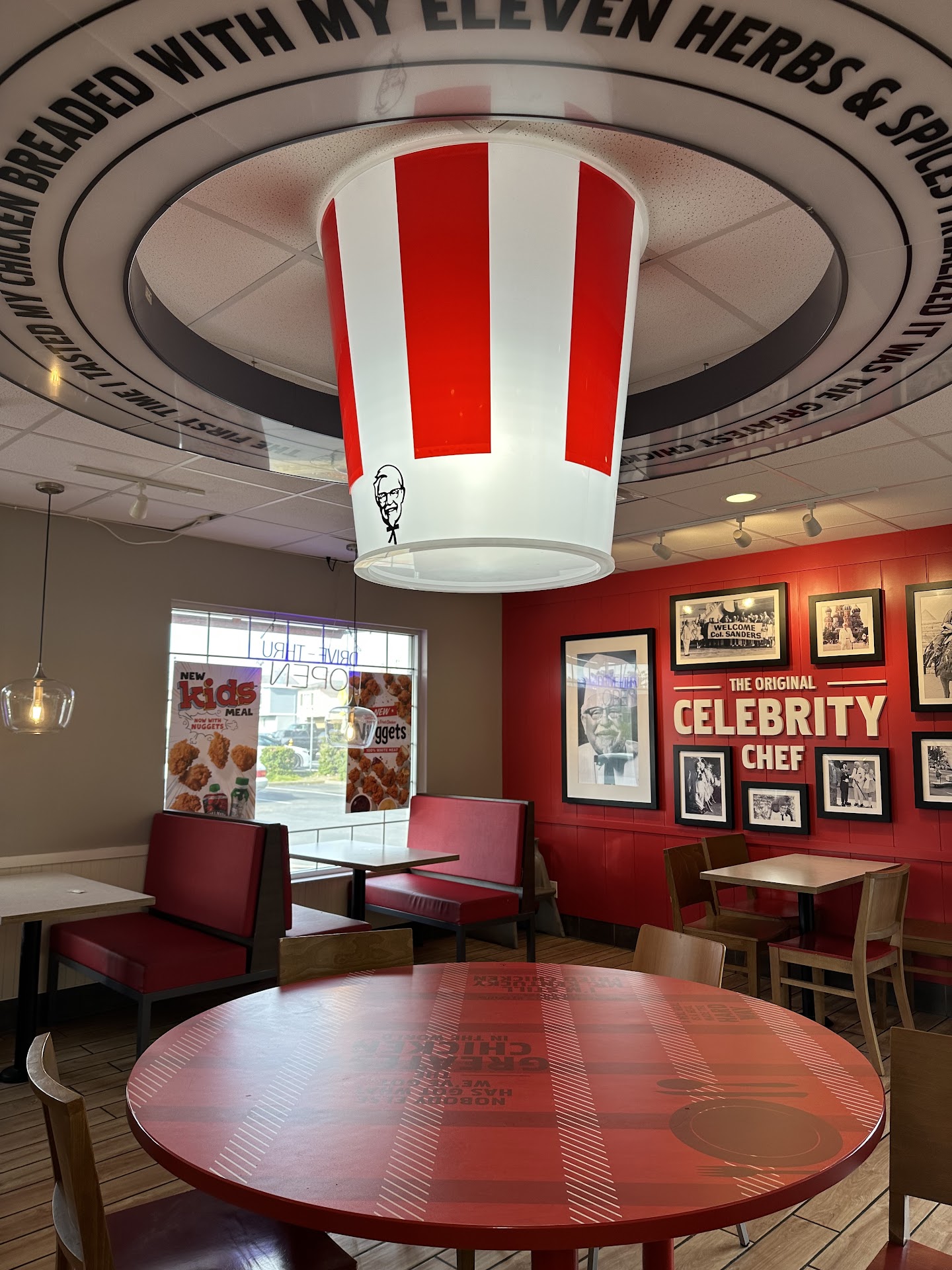 Read moreWorst chicken I have ever eaten. They must get there chicken that is rejected by people from a country that I won't mention that is known for it's starving population. I haven't eaten at a KFC in over 10 years and was actually looking forward to havening some again. Won't make that mistake again. Didn't see the "dazzling" interior mentioned in other reviews as we picked up in the alley way, I mean drive thru. If the Colonel ever visited this place he would lock the doors and burn the place down.