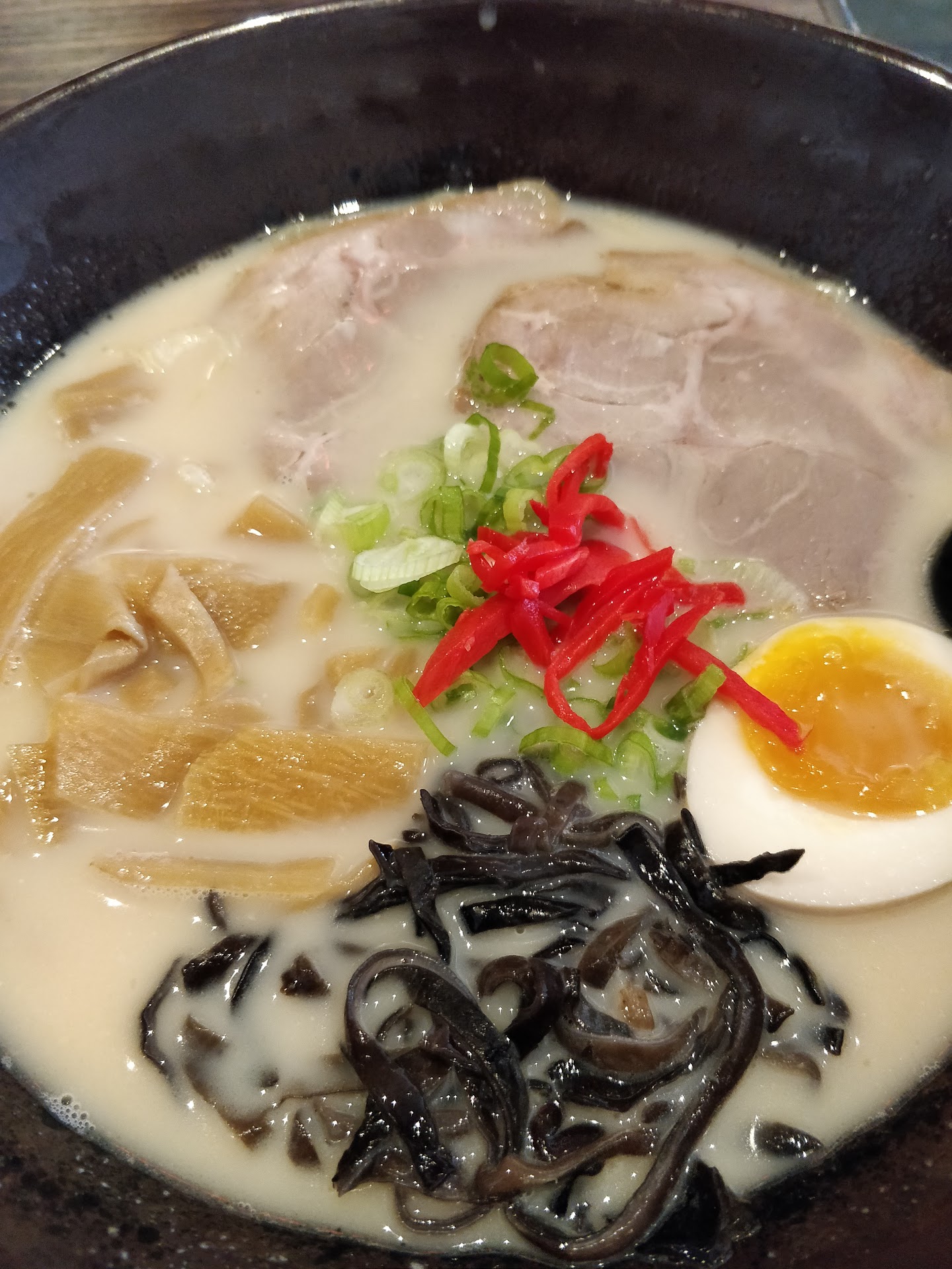 I ordered the tonkatsu ramen with extra egg, black fungus(kikurage mushrooms), and seaweed.
