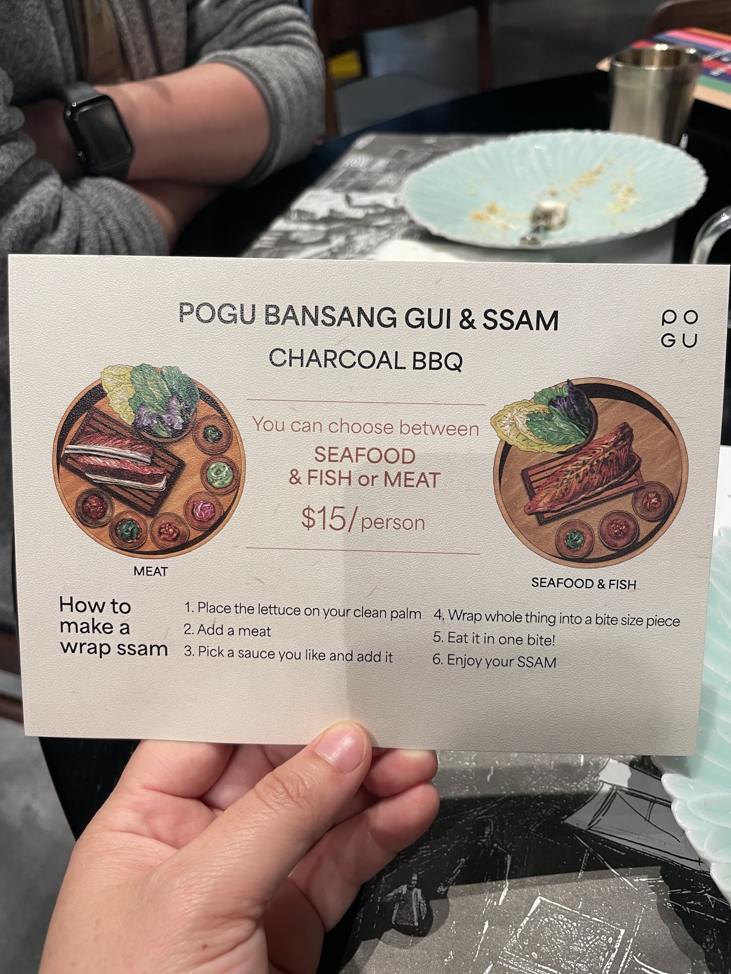 We selected the "POGU Chef's Pick Coursed Menu" with 5 courses. First course- pumpkin soup. It was sweet and my husband liked it a lot. I wish the fried toppings were a bit crispier. Second course- seafood salad. My husbands plate looked a little different even though we both orders the 5 course meal. He had a gray seafood sauce and I had a gochujang drizzle. The fish included squid, tuna, and salmon, but it seems like they were leftover/lower quality cuts of this fish. It was also packed a little too tightly and difficult to grab the seafood out. It was refreshing with the grapes. Third course: buckwheat noodles with shredded chicken. I was hoping when the server mentioned buckwheat noodles it was the cold soup but it was not. I think the seasoning on the noodles was a bit lacking but they did have the orange (sweet) and yellow (savory) options. Fourth course- I believe the server said Galbi, but it was definitely a pork rib lol. Honestly nothing outstanding. Meat was a bit tough and I needed a floss when I got home. It reminded me of an American/Korean bbq rib. I also wish we got more than one. The mushrooms were good but cold. The sauces were good. Final course- this was my least favorite of them all. Ice cream was extremely hard but it had cake at the bottom and caramel inside. Then smashed red bean at the very bottom.
