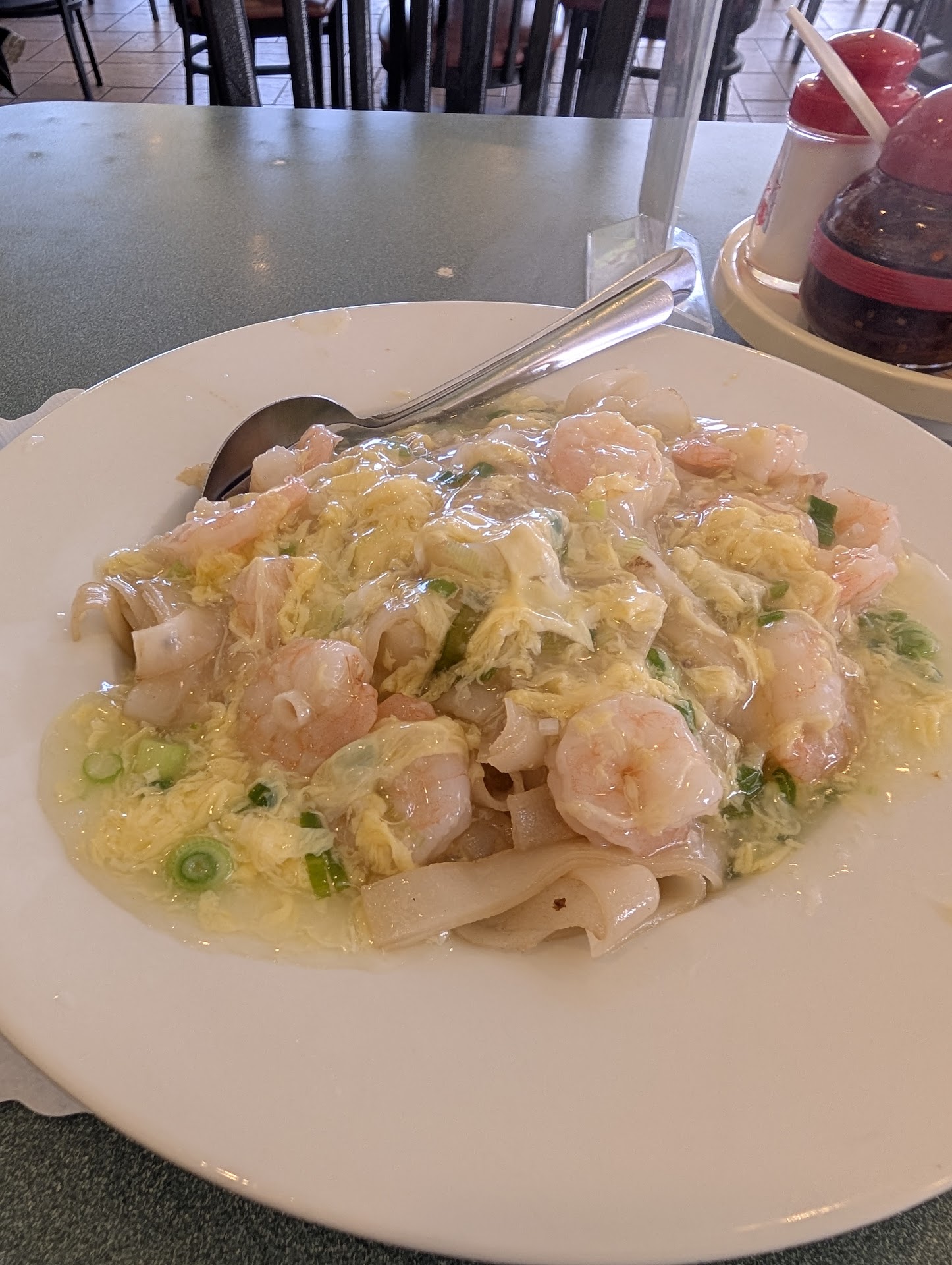 Came here for a late lunch and it was cold outside, I was tired and missed my lunch and it was almost dinner time. I had a long drive to my hotel and I knew there would be traffic. I just finished a job in the same parking lot. I walked over here as the other places said Cash Only on their door! I ordered the Shrimp and Egg Chow Fun and to go I had the Roast Duck over rice plate. I was super hungry and literally anything should taste good to me. I dug into the shrimp chow fun and was kind of disappointed đ the noodles they were using were not great. I think they were not the thick ones have had my entire life. They were thinner and skinner. They tasted like they were from a package of instant noodles. No Wok Hei goodness either. I didn't eat much and just ate the shrimp and eggs. Super disappointed. Since I didn't get any satisfaction from the chow fun I ate the Duck plate as well. That on the other hand was good. I just ate the meat and a little rice to cut the greasy fattiness from the duck. The service was fine and the hot tea was welcome on a cold rainy day. Not sure how to review this as it was bad for me on a easy well known beloved dish. You guys try it...
