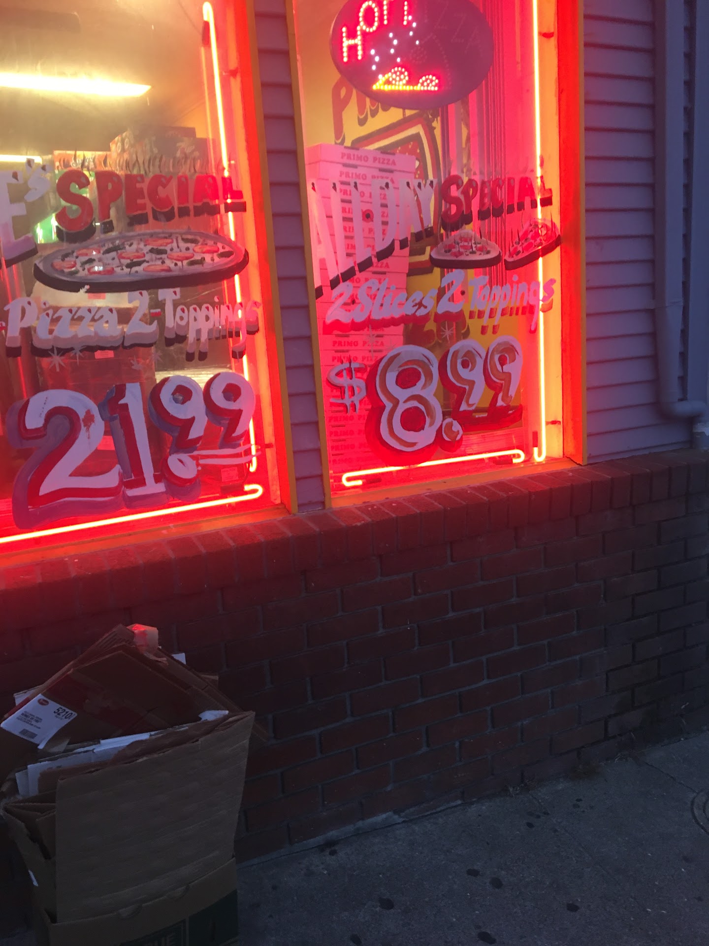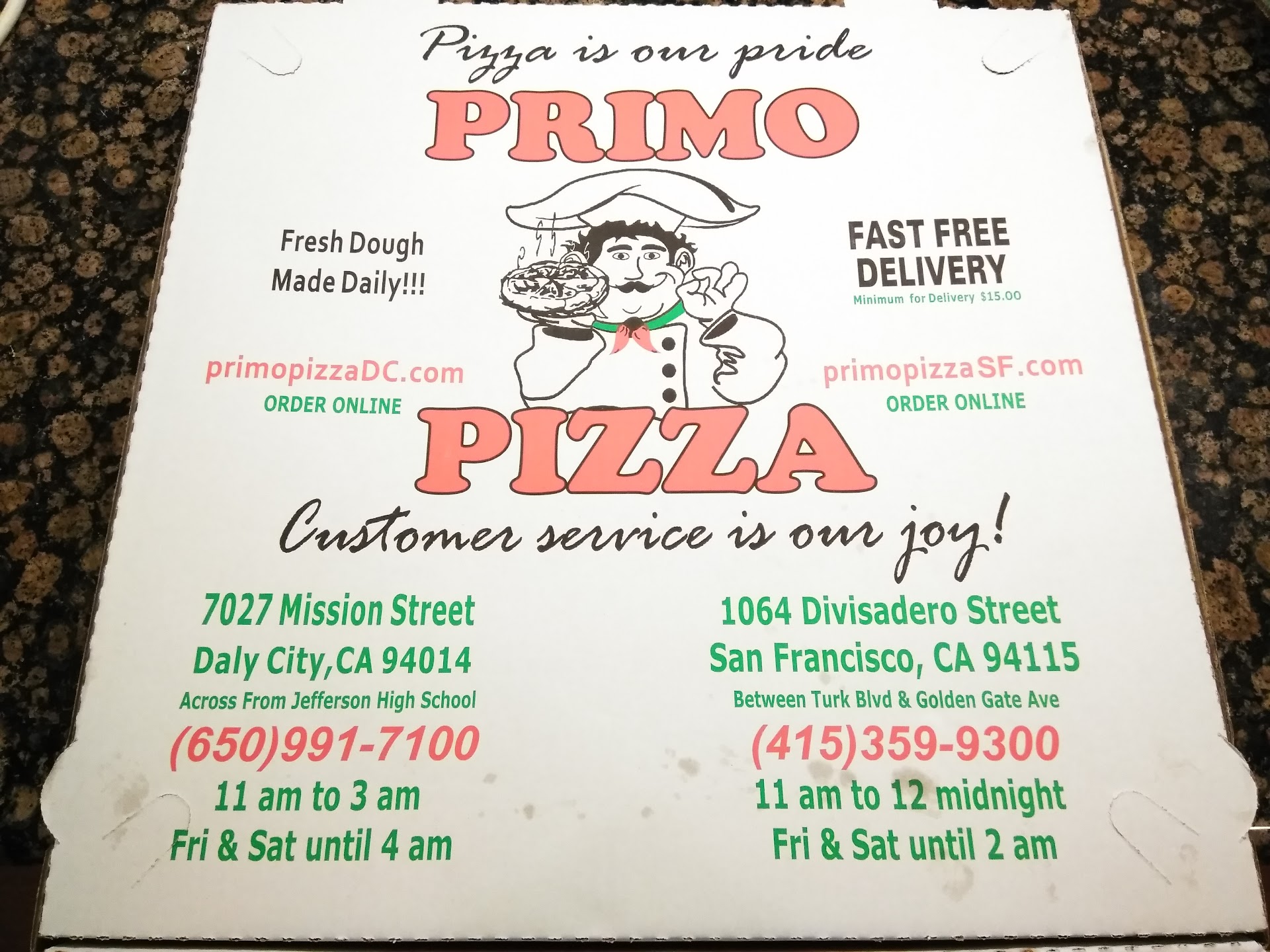 Read moreI first want to give a HUGE shout out to the staff at primo specifically the young lady working last Thursday night who was awesome and kind enough to charge my dead cell phone there after being locked out of my home. I had just got off a long day at work and not having a good day I was locked out and no phone to call anyone. Then when the charger I had wasn’t properly working you plugged your charger into my phone and got it charged enough for me to call a friend to bring my me my spares. Thank you again so much you know who you are. 2 huge slices of pizza for $8 great deal great food and best staff ever In the Bay. Make this place a go to you won’t regret it. Thanks again...