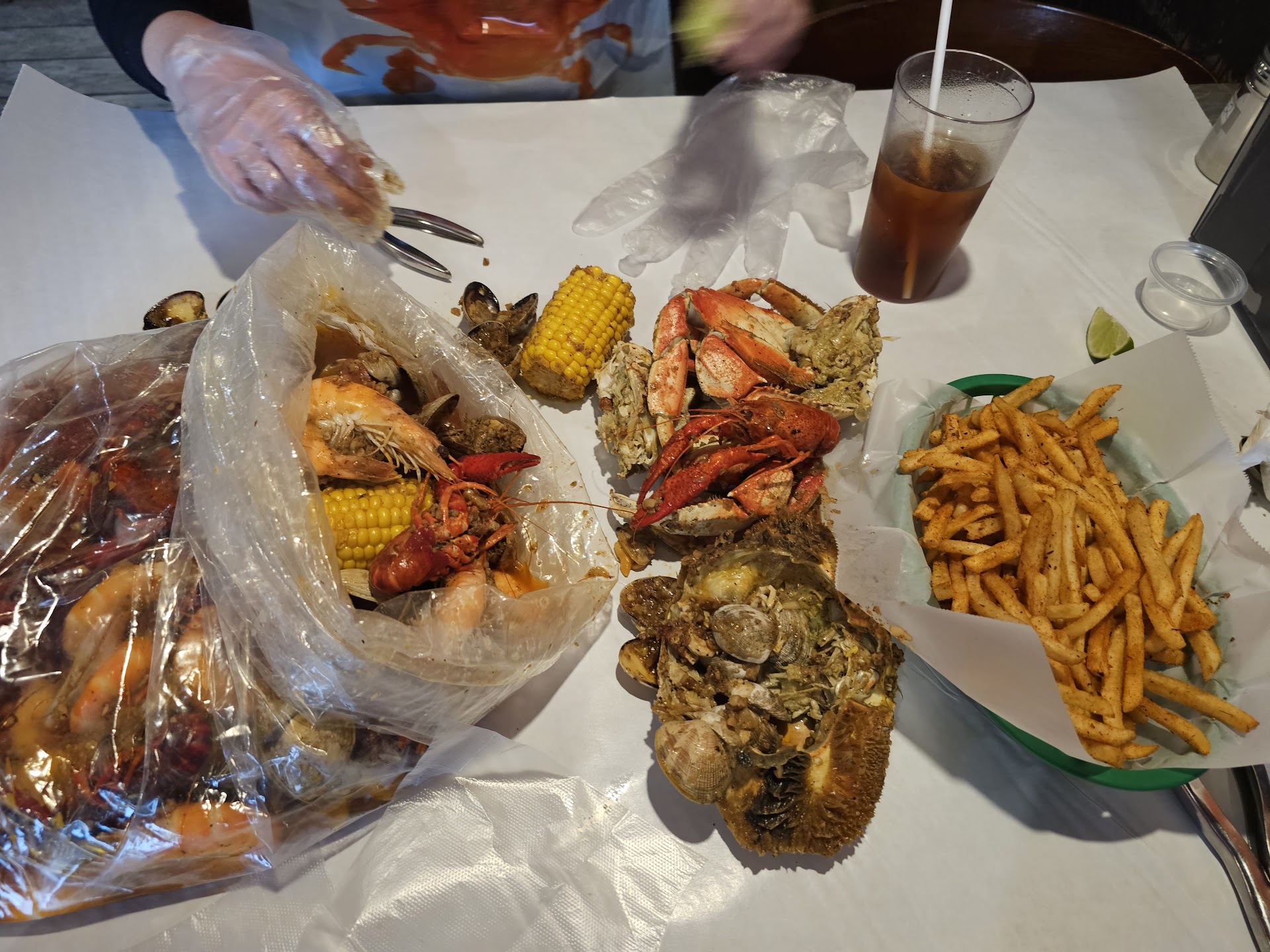 Combo One comes with 1.5 lbs of crawfish, 1 lb. of mussels, 2 corns, 2 potatoes, and 2 sausages. Don't expect the corn or sausage to be big because they're actually pretty small. The potatoes, on the other hand, are decent in size - not too big, not too small. The Cajun seasoning just make the mussels and crawfish taste much more delicious. I'm salivating just thinking about it. Moreover, this restaurant lost one star because of the tools used in eating here. Bibs, gloves, and plates are all disposable, but cups and utensils are not; Finally, easier to use than their plastic counterparts.