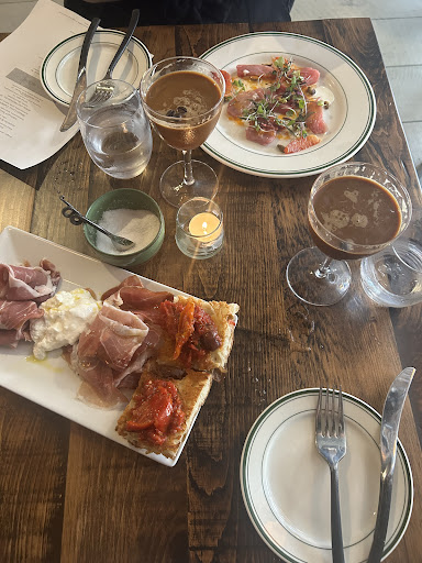 My wife and I walked in early for a 7:30 dinner reservation and the place was bustling. We hoped they weren’t going to put us at the 2-top right in front of the entrance door and the hostess smiled and said, “don’t worry. We have a nice spot for you in just a couple of minutes - come wait for it at our bar”. The bar is in the back - an amber-lit romantic space with a great vibe. We ordered drinks after the bartender ( again-friendly, smiling, nice!) put 2 glasses of water in front of us. The table became ready and they said we’ll bring the drinks to the table. After a slight mixup with 2 different servers ( both -again - friendly and engaged and nice) we got our martini ( could have been colder but good) and wine.