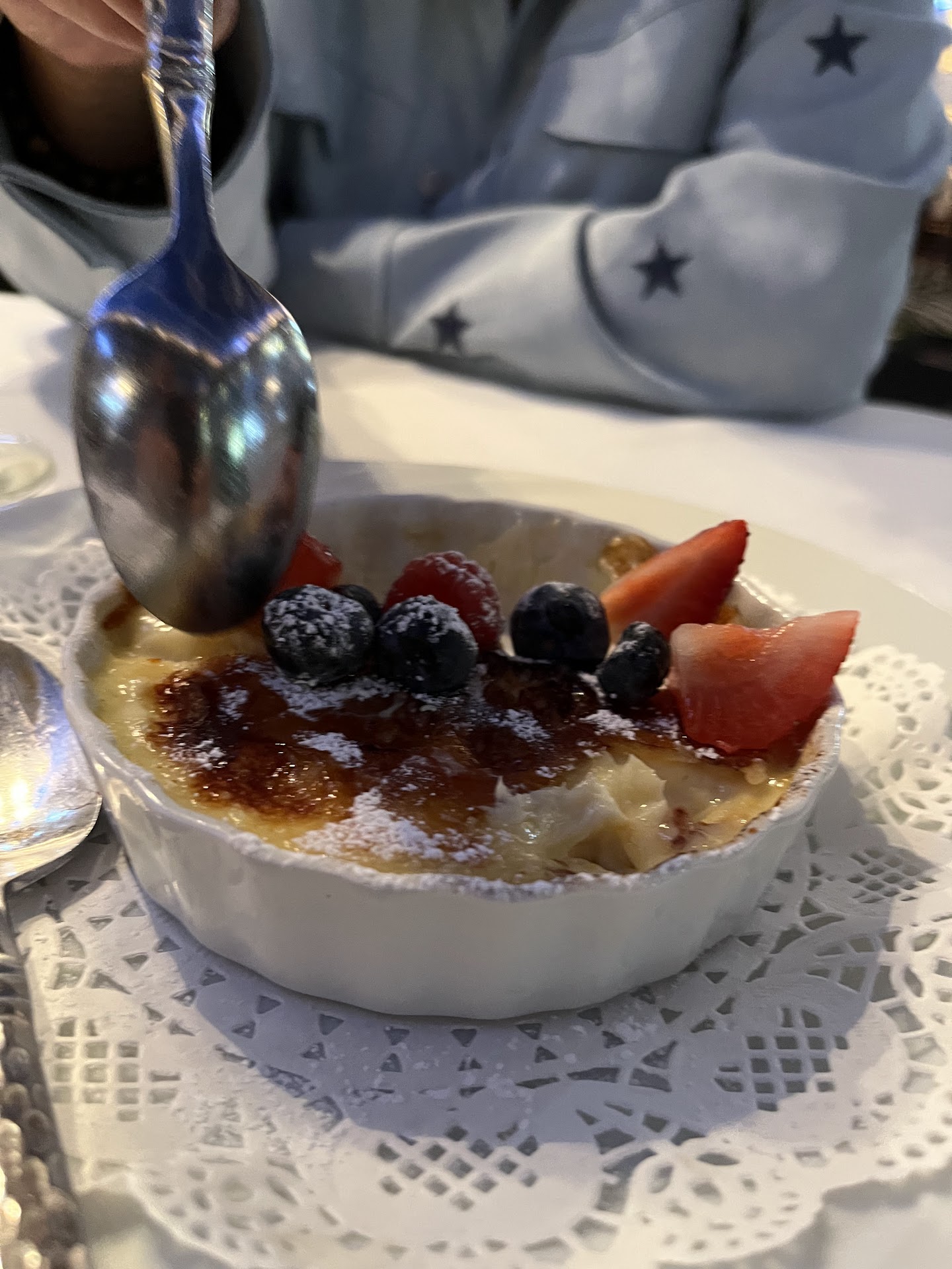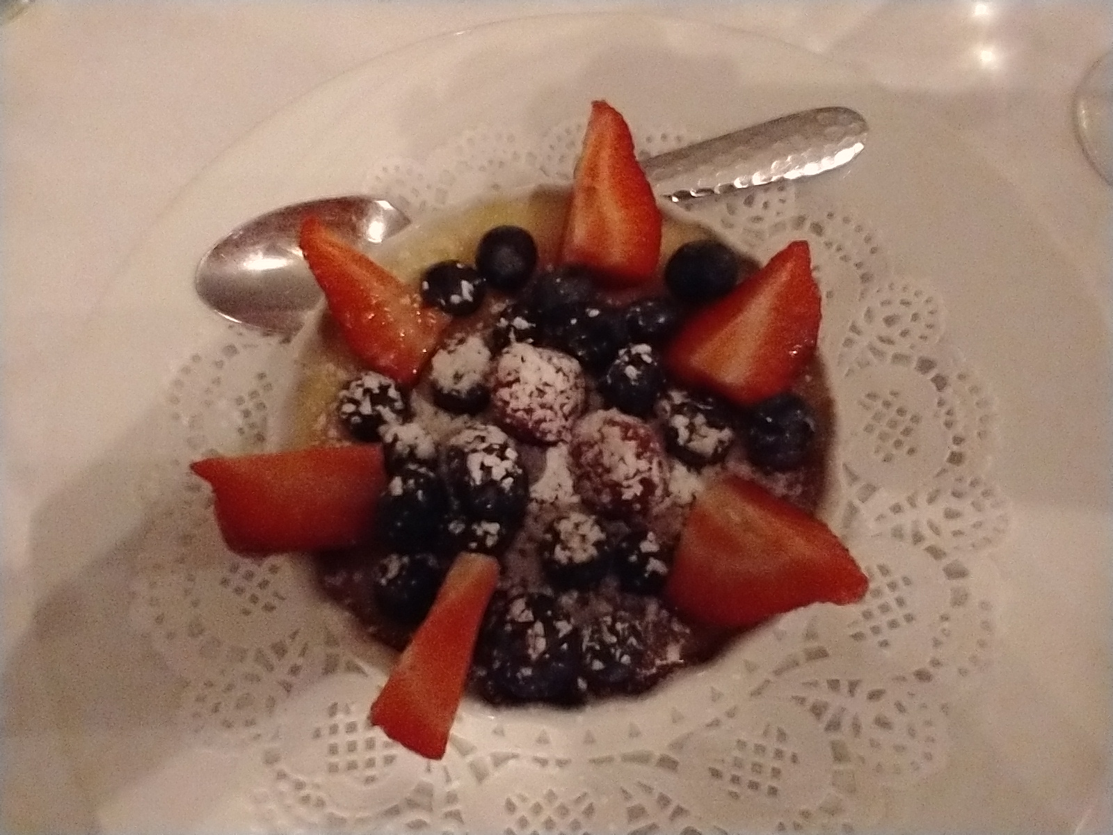 Finally, for dessert, my wife had the Creme Brulee - served in a large ramekin with artistically arranged strawberries and blueberries. Again, she raved about the flavor. I had the blueberry tart, and my sister had the Meyer lemon tart - both were delicious and not too heavy.