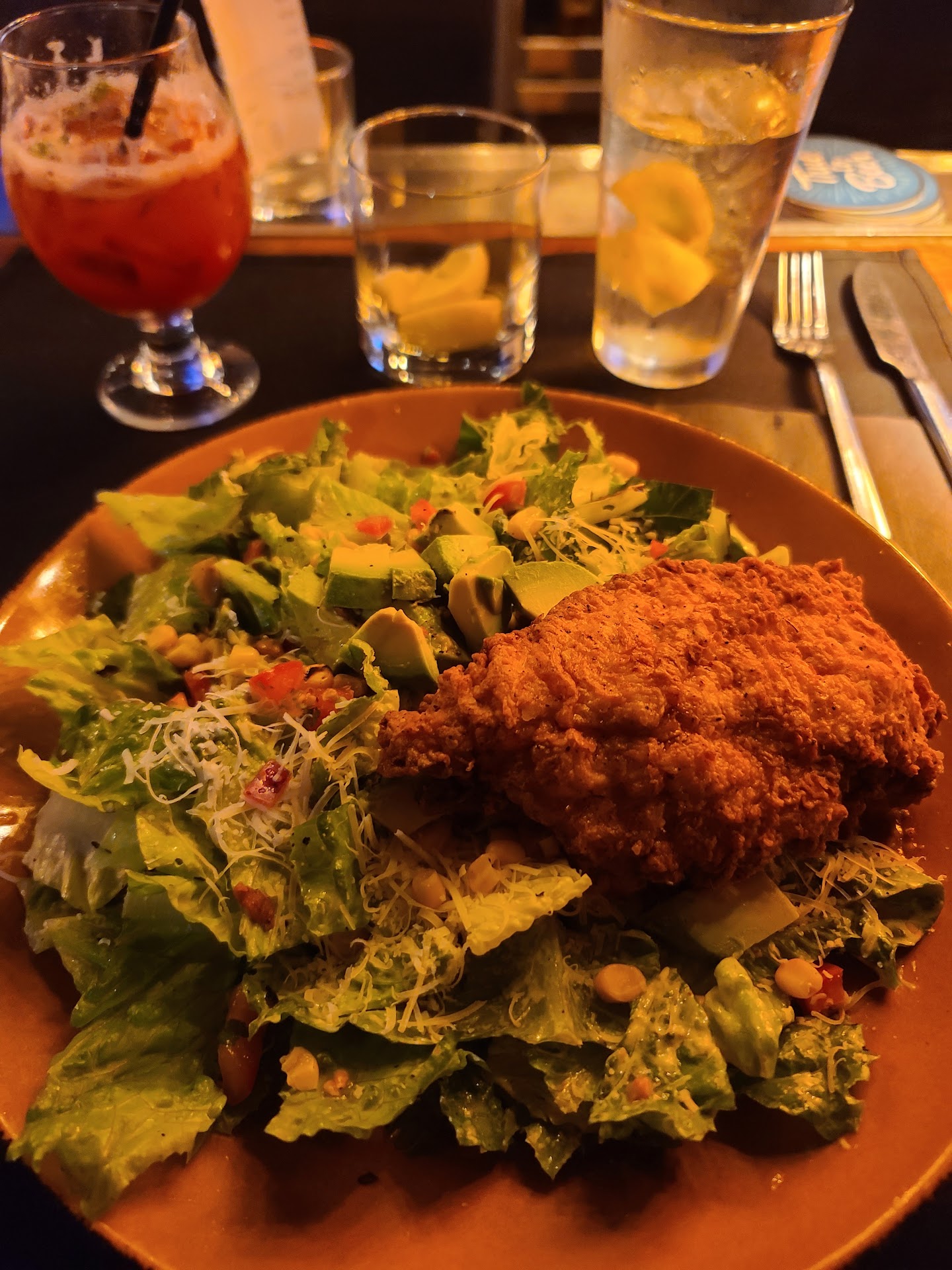 My husband ordered a chicken dish that, while it looked like chicken fingers, ended up being really flavorful. It came with smashed potatoes and a half corn cob, visually, the plate could use more color or variety, but he really enjoyed the flavors.