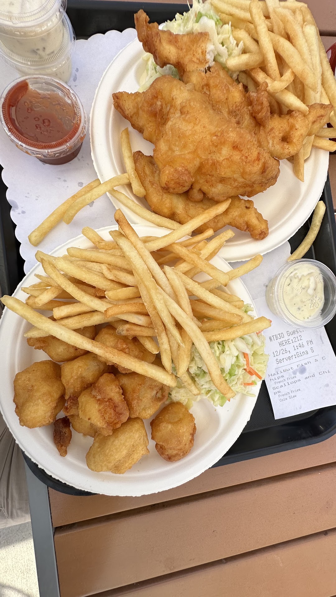 The cole slaw tasted like rotten cabbage, the breading on the fish was thick and tasteless and my friend was served about 10 fries and I was served a huge piles of fries. No consistency in portion sizes.