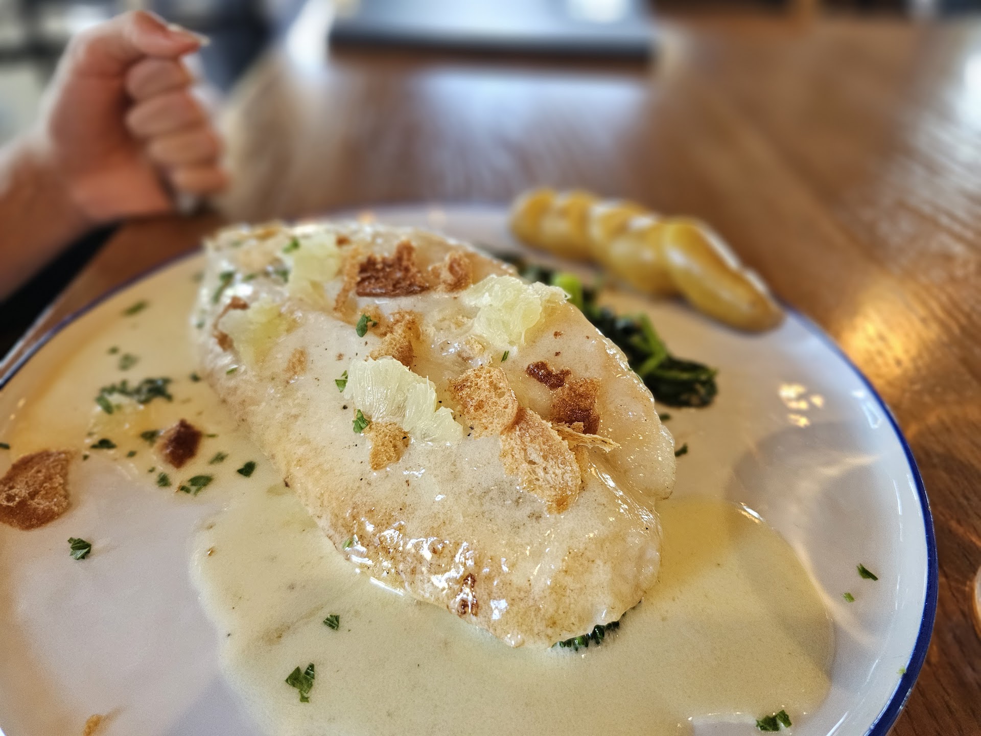 Read moreFood was good, with some improvements needed. We were a bit disappointed that bread and butter (usually complimentary at restaurants) was an extra $5 charge. The lobster ravioli was good, but definitely over salted. I enjoyed the big chunks of lobster that came in the center of the dish. The lemon sole was excellent, and a very generous portion. The fish and chips we were told were cod. However, when it came out it was definitely not cod. Probably sole or halibut as it was a much softer fish than cod. The breading on it was light, which was nice. Wagyu burgers were good and pretty standard. You really couldn't taste a difference with the wagyu meat. The fries were delicious and enjoyed by everyone at the table. For dessert we tried the cookie and cream, cheesecake and butter cake. The cookie was delicious, but it was smashed flat on the dish (intentionally). A thicker cookie where you can enjoy the fudgey-ness of the chocolate cookie would have been better. The butter cake was just ok. It was over baked and dry. Both desserts could have used a bigger scoop of ice cream. The one provided was kind of embarrassingly small. More ice cream would have definitely helped with the dry butter cake. The cheesecake was the best dessert of the 3. Not super dense and rich, but still delicious. Overall, we enjoyed our visit. It was a little hit or miss, but we'd definitely dine here again. Oh, and we were celebrating two anniversaries and aside from a "happy anniversary" from the hostess, our celebration was not acknowledged in any way. So that was a disappointment. Was hoping for something a little more special for my parents who were celebrating their 49th...