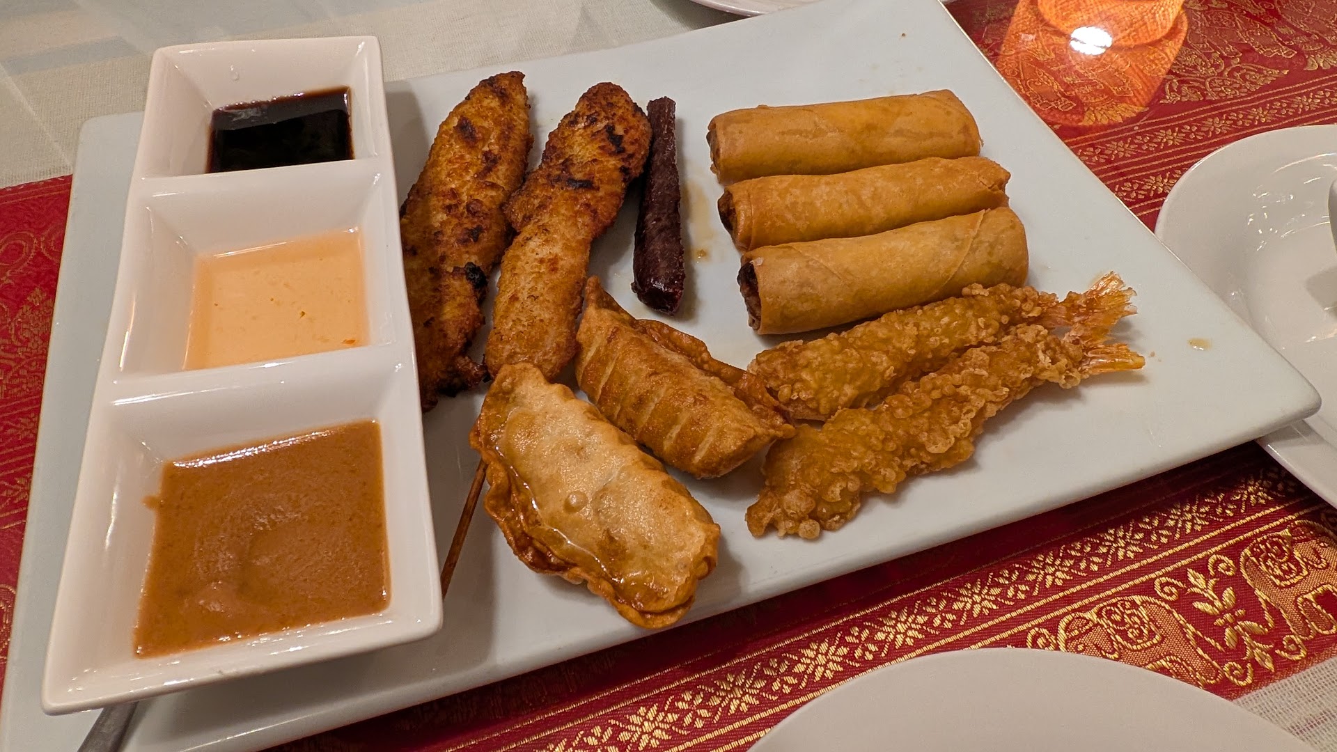 My friend and I, we ordered Bangkok sampler, Kai Mamuang, Moo Pad Prik, Shrimp Tom Yum, White wine and Thai Ice tea.
