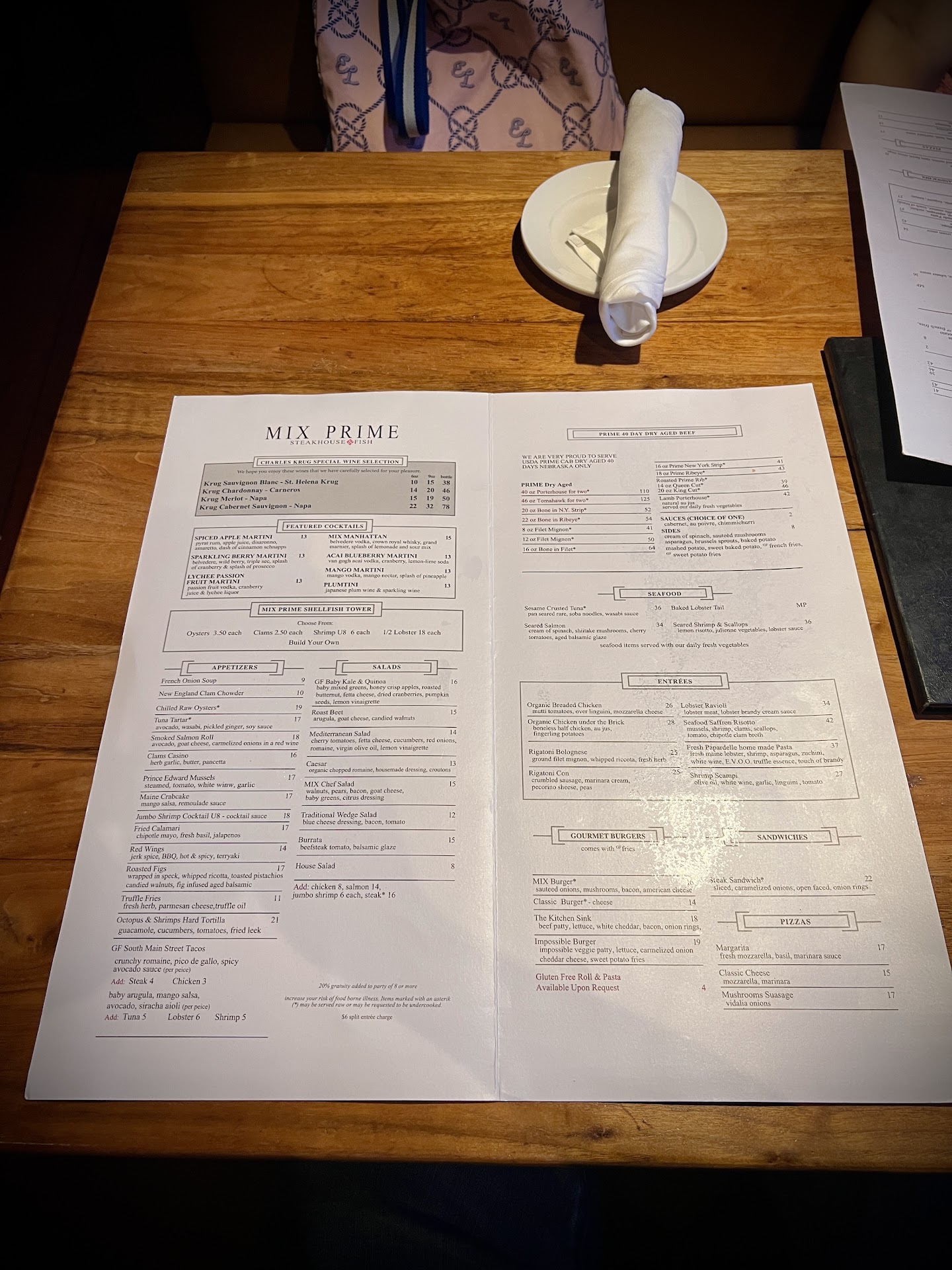 Read moreHaving had Mix Prime on my culinary bucket list for an extended period, I recently seized the opportunity to dine there when a trip took me an hour from home to Waterbury. Our reason for the journey? Picking up wedding photos from our photographer, who conveniently resides in the area. We arrived at 7:30 PM on a Thursday evening to find a pleasantly intimate and luxurious setting, perfect for a romantic date night. The reservation process was seamless, thanks to the amiable host who promptly escorted us to a booth adjacent to a floor-to-ceiling glass window. While the drink menu exclusively featured cocktails, the staff were accommodating enough to craft a delightful mango-flavored mocktail for my alcohol-free evening.