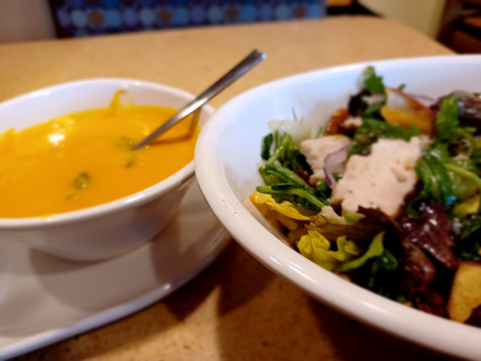 Had a gift card so I ordered the Vegetarian Autumn Soup, Fuji Apple Salad with chicken and Cappuccino. I've been to Panera before and have enjoyed what was ordered. This time, not at all.