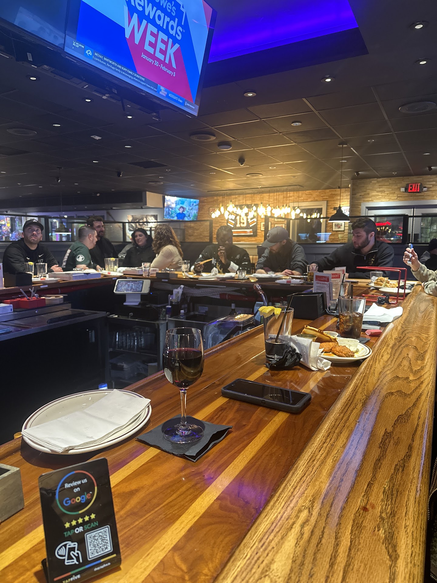 The atmosphere is nice and clean. Bar service was very attentive, even to let us know when our food was ready when we were in the other room playing games.