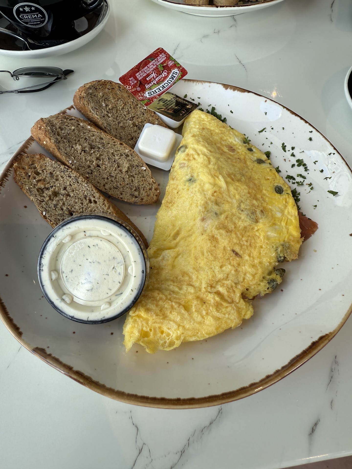 Food: we were recommended to check out the Pancakes Breakfast and the Feta Cheese and Tomato Scrambled eggs. Pancakes are comparable to Bake Shack, thick, fluffy in inside and nice crispy crunch on outside. Good eggs and bacon to accompany it. It was big enough for me to share with my little one as well since pancakes are a good portion size. For the Feta/Tomato scrambled eggs- they were pretty good, light and fluffy as well. It came with multi grain bread baguette pieces with butter/jam and it complemented nicely.