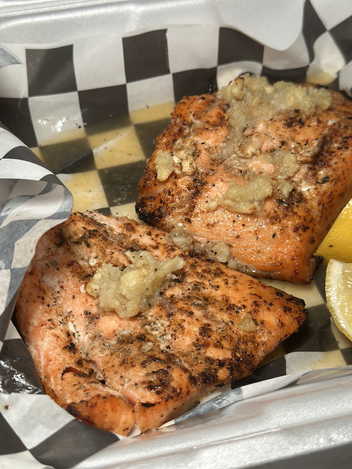 While I originally stopped in for smoked meats, I opted for the grilled salmon. I had a flight the next day and I figured it would be lighter on the stomach to where I could finish it and not have an abundance of leftovers. I ordered Mac n cheese and greens for the side. The owner (woman owned) did let me know that it would take a bit for the salmon since itās made to order so I sat at the bar and ordered a tequila lemonade.