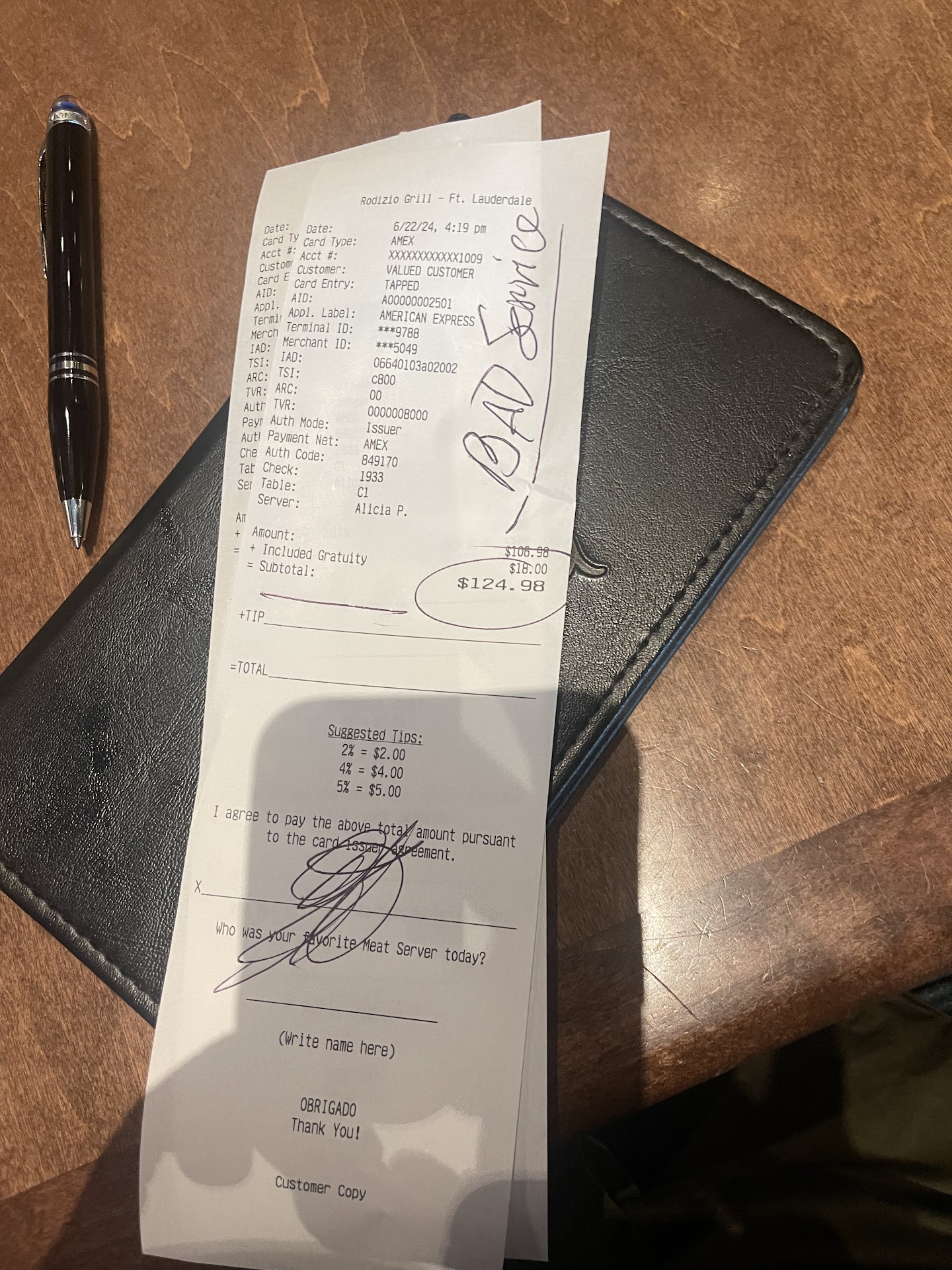 Thank you, my wife and I went to the restaurant next door, Saito, where the managers were totally professional, and we had a good time. We ate with a Jamaican family and a couple of women from the Dominican Republic, and we had a wonderful evening at the Japanese restaurant, paying $117 plus tip. I paid more at Rodizio for not eating, and Claudia allowed them to serve me half a glass of wine, according to her, due to corporate management justifications. I drank two bottles of sake at the Japanese restaurant and went home!