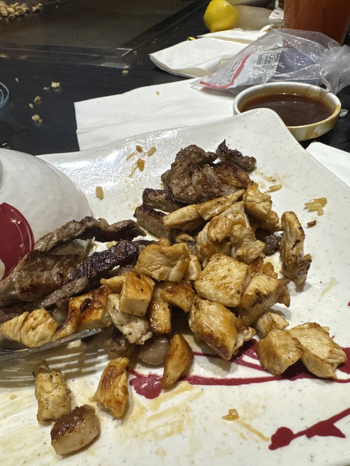 Our order was for the Steak and Shrimp Super Combination Dinner, which we shared, with a side of fried rice. Our waiter, however, started by bringing us soup and salad. The salad was chilled and tasted great, but the soup was shockingly cold. I informed the waiter of this issue, and he promised to return with a hot soup. When he did, it was, at best, warm not hot.