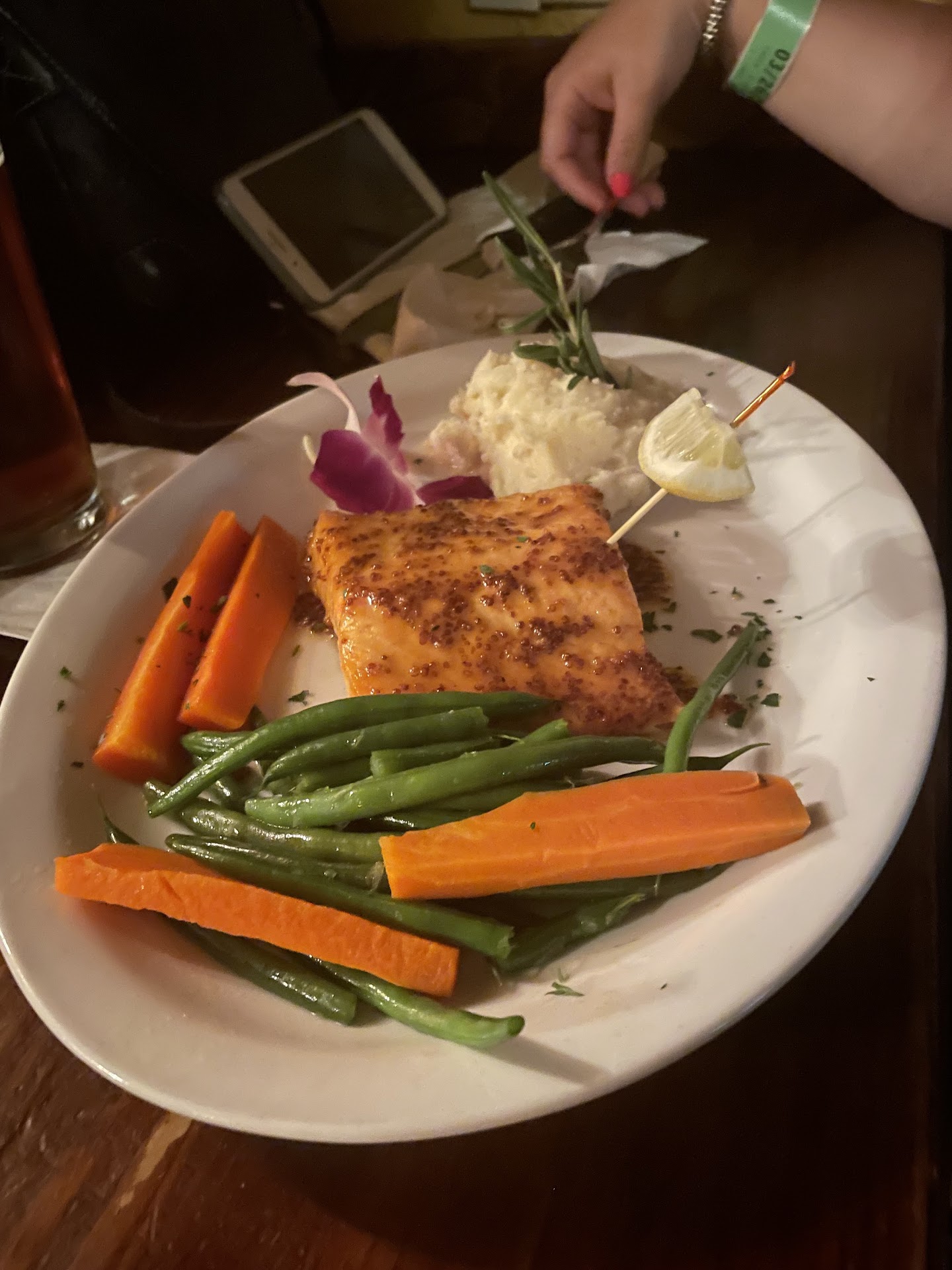 Now it gets worse. The food wasn't good. The Boxty pancake was and soggy, rubbery and tasteless. The corned beef and cabbage was small chopped unidentifiable pieces covered in some gloopy sauce. The salmon was OK if a little overcooked and dry. The mussels were OK but the normally flavorful broth tasted awful. The chicken pot pie was smaller than a frozen Banquet TV dinner and after picking through half of it I found one small piece of chicken. Also the sides, mashed potatoes, green beans and carrots were still barely warm. We were starving so we picked through and ate what we could but my friends, who live nearby and eat there regularly kept saying how bad the food was.
