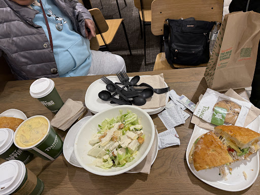 As a long time customer of panera (in general) my recent trip was a huge dissapointment.Ordered a green passion smoothie it had ice chunks, the associate did not ask me for a size preference. Ordered a you pick 2 with the bistro french onion soup and tmozz flat bread. Asked for no cheese in the soup because i sometimes share it with my spouse who is lactose intolerant. Found the cheese at the bottom of the cup in a distgusting mess. My flat bread was put together diagonally creating a heart shape i didnt "love" most of my cheese fell out of my sandwich. I watched as the woman just dropped the pesto and sofrito onto the sandwhich in a mass instead of properly spreading it. And to top it off i wasnt given side options so i was rang up for a baguette....which without asking i was given an asigo cheese loaf chunk. Im guessing they were out of baguettes but communication with the customer is key. If they had asked i can promise you even if i wanted bread i would have asked for anything but. Bonus? The bathrooms were gross...and when a customer is literally in the middle of a transaction and another customer mistakenly takes over the register, atleast apologize to your...