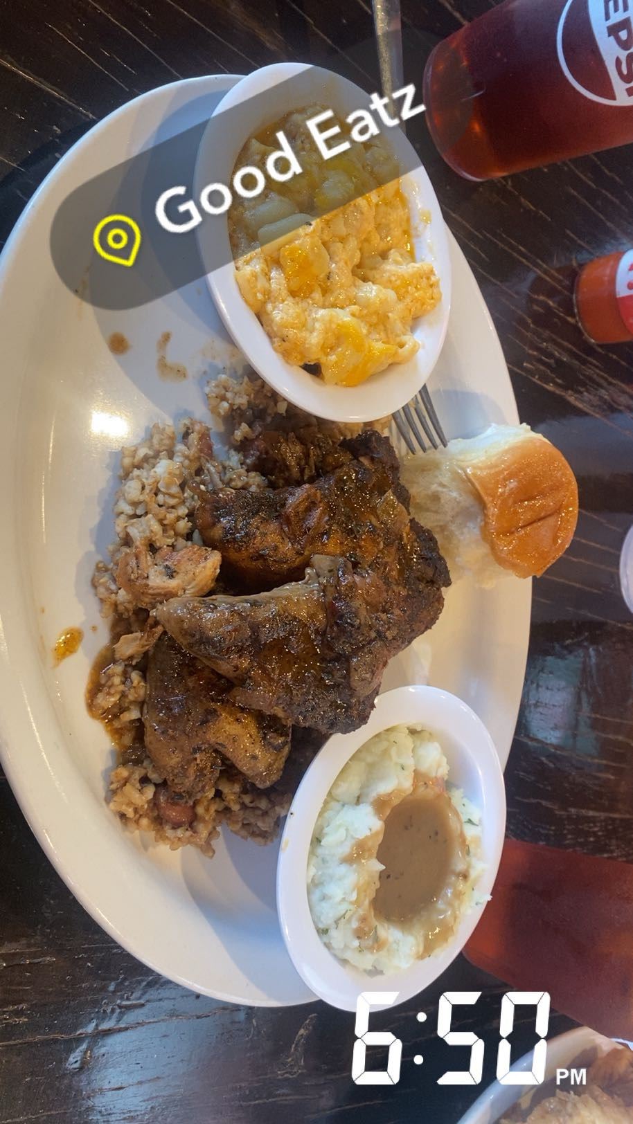 My only complaint is that the rice dressing for the jerk chicken (on my plate) was a little salty. Aside from that, we loved all the sides and the breading for the fried pork chops was unbelievably good. Great sweet tea as well. They are a little pricey, but worth every penny. All the staff was accommodating and checked on us, including who seemed to be the bartender.