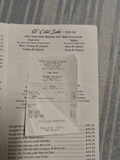 Ā Ā Ā Read moreComplete let down again! My pizza 2 weeks ago was alot smaller than the box. Then tonight I decided to get my favorite Italian Cosmo and a chicken cheesesteak in the garden for my wife and I'm still trying to figure out what just happened to us. My Italian was not even close to what it use to be, the meat tasted awful and I paid for a Cosmo and it was barely warm. The oil tasted like Italian salad dressing. The chicken cheese steak barely had any chicken on it, just alot of cheese. The best part was the added charge of $3.00 for "open food" to our bill plus the tax. This place is definitely not the same, not even sure if it is the same place. So let down, personally I will not go back. 9-6-2025 I must respond to the ridiculous apology that includes insults from the "owner" . First I didn't complain about the pizza because we have been coming there for a long time and figured it was just a fluke. I'm not arguing about the food other then it was awful. I don't need smart remarks about how long it takes to get from Millville to Danville, it takes me 12 minutes. One suggestion I have is to wrap a Cosmo sub in aluminum foil and it will stay warm or hot alot longer instead of a cheap stylofoam container. I did appreciate the call to my wife but since you posted your apology I will definitely pass on the "free subs". In fact you can donate them to a homeless person. Do not reach out to my wife again and we will definitely NOT be coming back to...