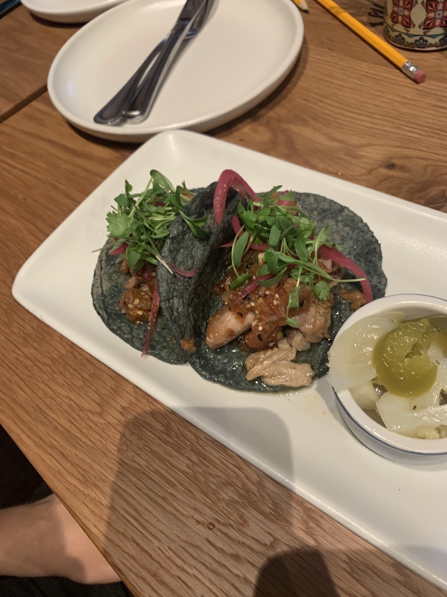 We started with the carnitas tacos which were super flavorful on housemade blue corn tortillas. I always order pozole if it’s on the menu and I wasn’t disappointed. It came with a wonderful, DIY presentation that allowed you to self garnish the dish to your preference with radish, housemade hot sauce, cabbage, and more. The pozole was super savory and chock filled with hominy and pork which could have been a main dish on its own.