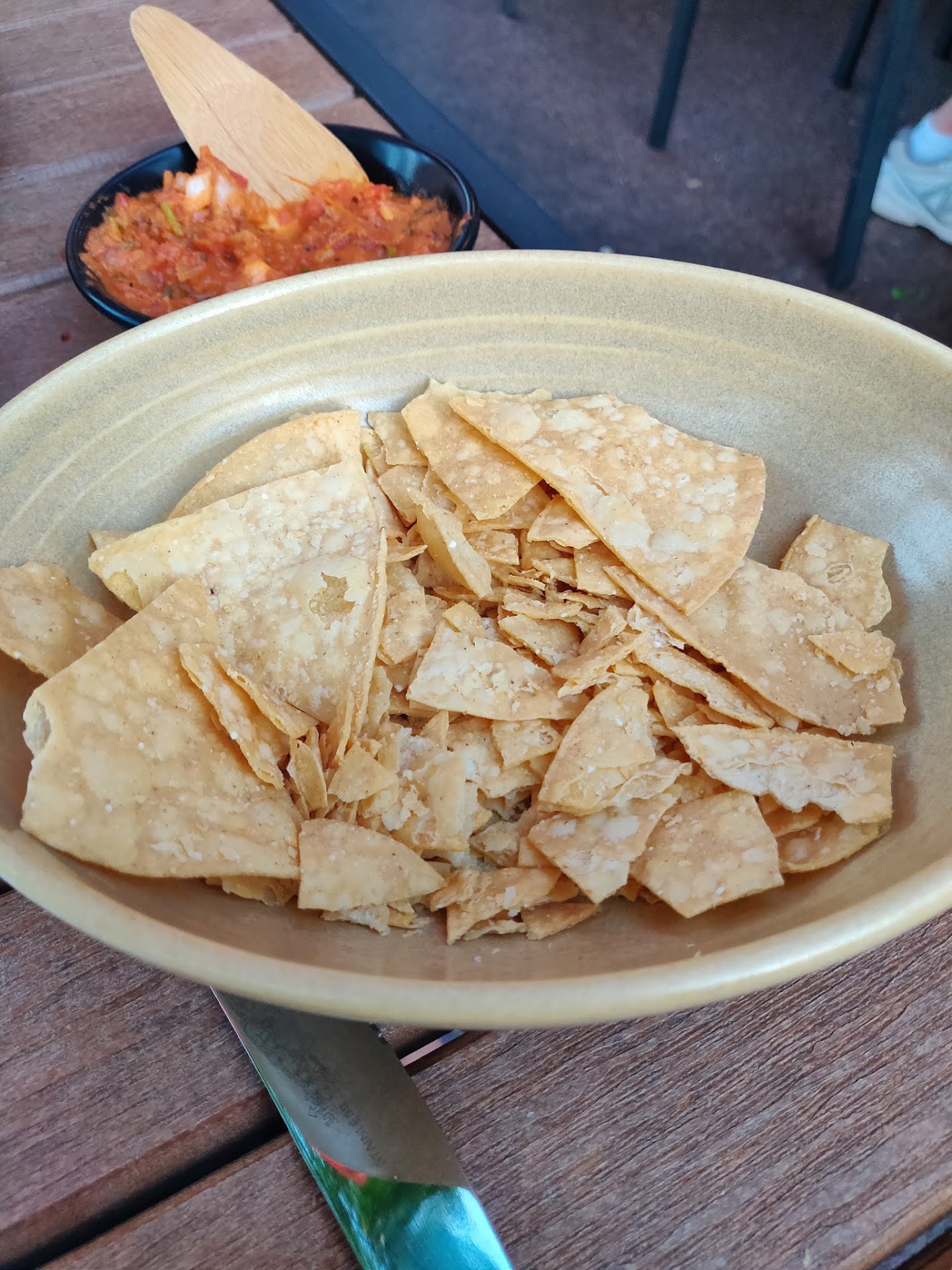 We wanted to try a new restaurant nearby and decided on Cocina Hermanas. Well, technically it was a second choice after Harvest had a 30 minute wait for an outside table. Turns out we should have waited. The restaurant is well decorated and the staff was pleasant. We were greeted immediately upon entering by the hostess who showed us to an outside table where we waited for our server Delia. About short time after a pleasant young man named Forrest with a bright red beard and hair dropped off some water, Delia came by to take our orders. We started with the Queso Fundido dip with chorizo. For mains, my lady opted for the mahi mahi ceviche, and I decided to try some appetizers including the elotes (street corn) and pork belly chicarones. We also tried their Pina Gordita margarita.