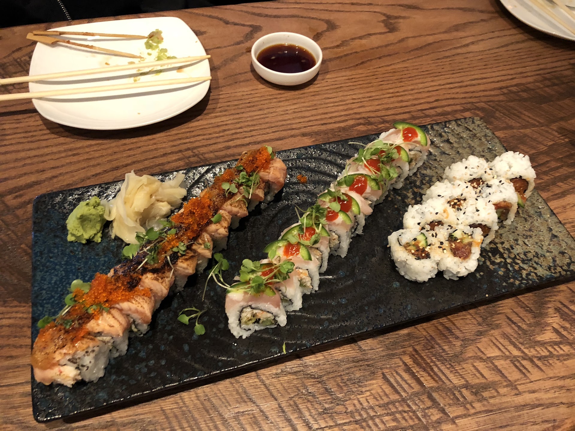 Terrible service and mediocre sushi. I feel deceived by the high ratings. The sushi is overpriced and contains mostly rice. We got the butterfly roll ($17! And mostly mayo), spider roll, and shrimp tempura roll. All were relatively small, so we didn’t feel full even with all that rice.