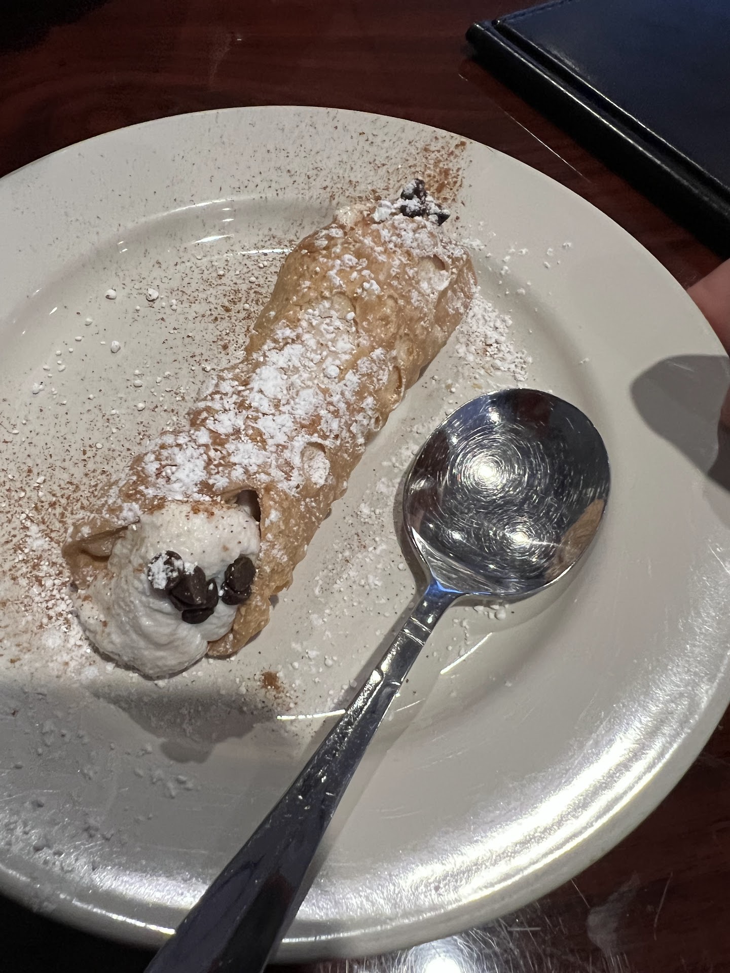 As I said in the beginning we got the Pizza, and we also got the Salad Bar, which was very fresh. For dessert, we got the Cannoli and the Honey Graham Cheesecake. The only criticism I have, is that although good, the Ricotta Cheese in the Cannoli was not as cheesy tasting or heavy as one would expect a homemade Cannoli to be like.