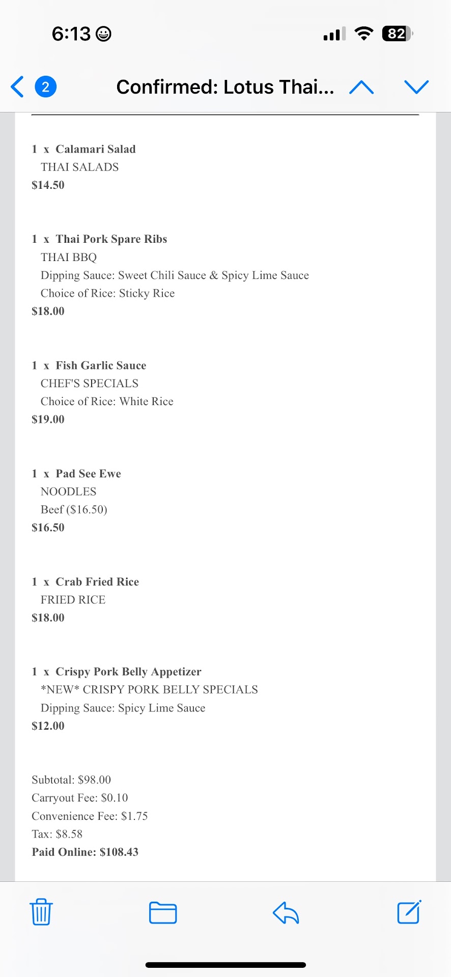 Read moreDelicious! Picked up a to go order for our picnic today. It was the first time we’ve ordered here. The spicy crispy basil chicken was so good! It had quality pieces of chicken breast (no gristle or chewy gross pieces) and a good amount of them. The medium spice was perfect. Not too spicy but not mild. The vegetables were great, too. The papaya salad was a good amount of green papaya and lots of peanuts. The dressing was plentiful and perfectly tangy and sweet. The tofu and veggie pad Thai had just the right amount of sauce. It was a perfect balance of peanut, sweet and salty. The chicken satay was also quality chicken breast with a perfect coconut marinade and a delicious peanut dipping sauce. We finished off the meal with the mango and sticky rice. Yummmm! The Thai iced tea needs to be stirred a bit, otherwise it starts out a bit too sweet. But I’d order it again. We split the dishes between three people, we had seconds, and we had enough for a few more meals late. We’ll absolutely be back...