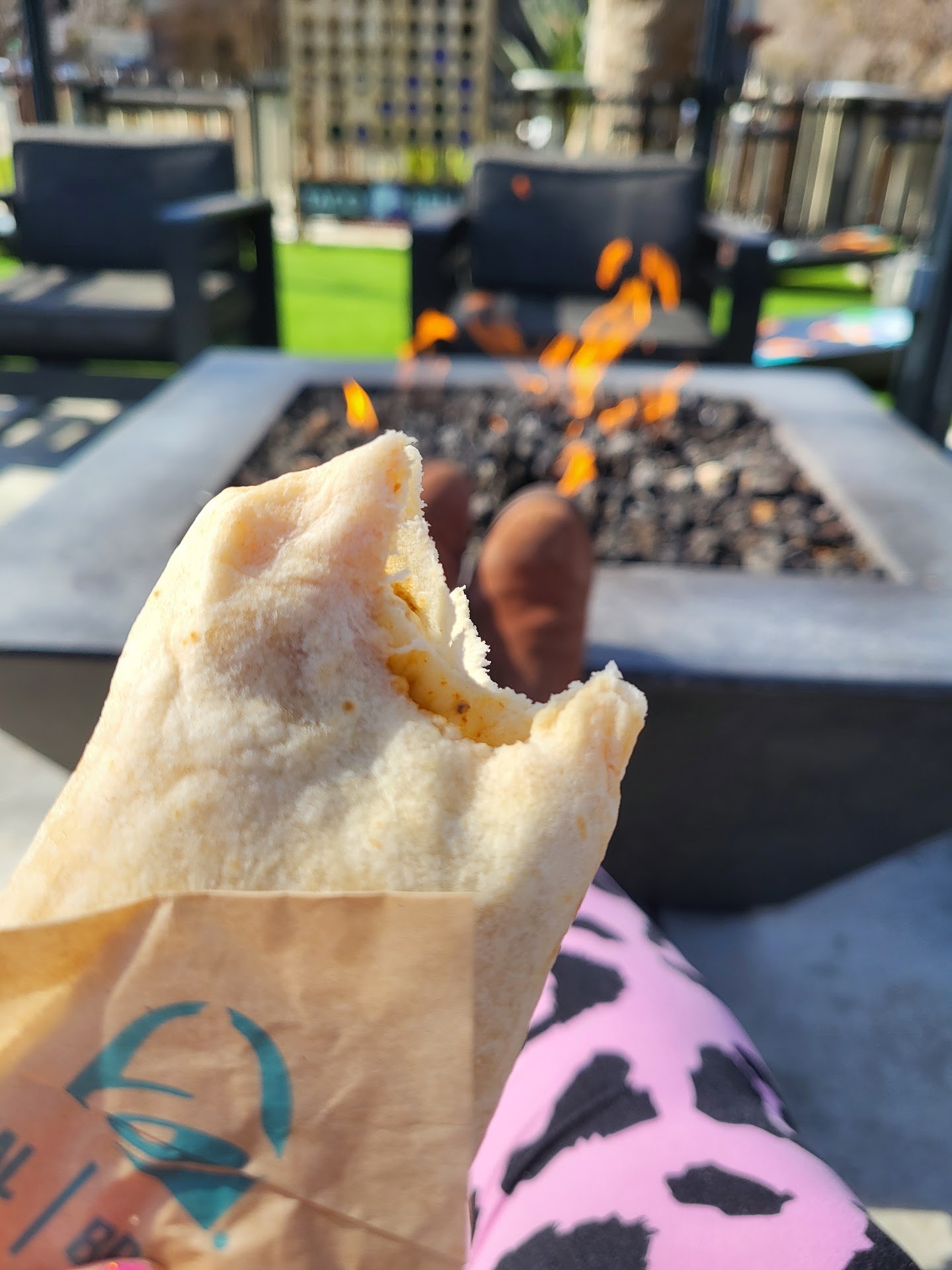 There's plenty of outdoor seating in a fenced area for eating or drinking, and a lounging area with two gas fire pits, and cushy seating for eight. There are some outlets near that seating if you need to charge up. There are also four overhead radiant heaters for cooler evenings. The entire patio area is nicely sheltered by several mature shade trees.
