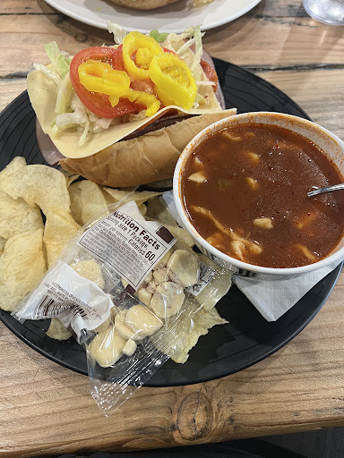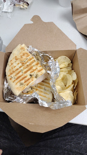 Not bad, but from the brownie batch visible in case, I thought I was getting a good size piece considering the price. But since they put it in a round container, it was much smaller. Boo! But it tased good. Yay! Wife got the soup. Was supposed to come with focaccia, but she got a packet of oyster crackers. Boo! But creamy chicken noodle soup was good. Yay! But the Panini made up for the snafu. Good portion. Great flavor. Worth the $11.39. I was concerned but they pulled it off well. Yay! Get squared box for desserts, and give the focaccia instead of crackers like advertised, and it would be all "Yay's!" & 4 or 5 stars. Will still go back. Official score:...