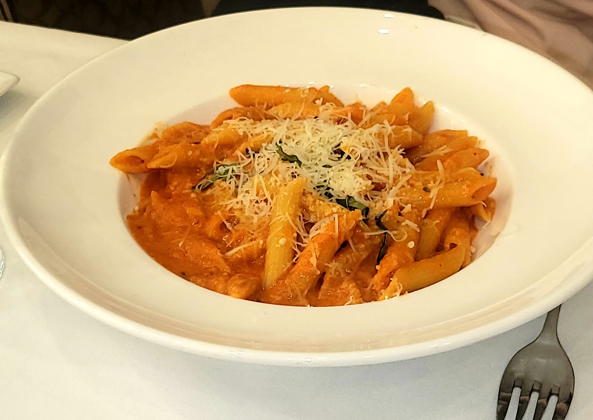 For instance, I was surprised to be charged $12 for a small side order of penne. The Eggplant was a small portion at $25 .Additionally, the service left much to be desired. We felt rushed and somewhat unwelcomed throughout our meal. Please note , we were dining at 4:30 with one other table occupied. At one point, our server attempted to clear plates while one of us was still eating, and they also took away the salt and olive oil towards the end of our dining experience.