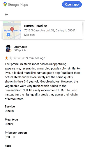 Read moreI usually don't have a problem writing negative reviews but I hate that I had a bad experience with my food from this place so I feel kinda bad with this one. I live nearby and always wanted to stop in. I finally did today and ordered the big burrito to go. I always get ground beef with my tacos or burritos and did so with this place. The first bite I took, I had to spit out at least 3 of those super tough veiny things. Not even sure what it is but I always notice it in less than quality beef. This is the worst I've ever experienced it. I was starving so I kept going. Every bite I had to spit out at least 3 of these things. I got about half way through before it finally grossed me out so much I had to stop. Luckily it was big and the rice and beans (which were delicious) finished me off.