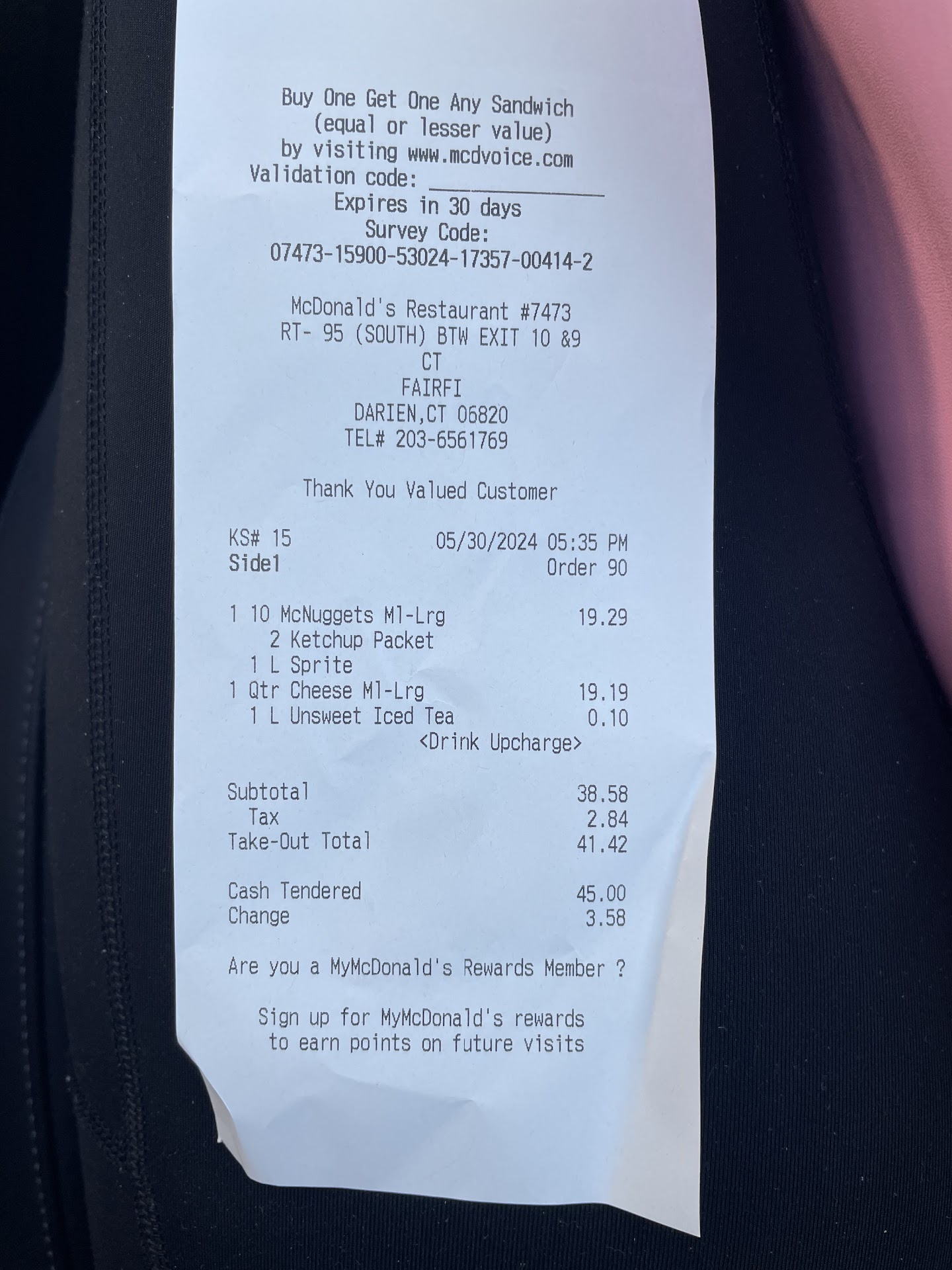 My recent visit to the McDonald's at I-95 South Service Plaza in Darien, CT, left me utterly appalled. Upon ordering three Big Mac meals, I was staggered to find that the total came to nearly $80. Yes, you read that correctlyâ$80 for three meals at a fast-food chain that prides itself on affordability. This exorbitant pricing is not justifiable by any stretch of the imagination.