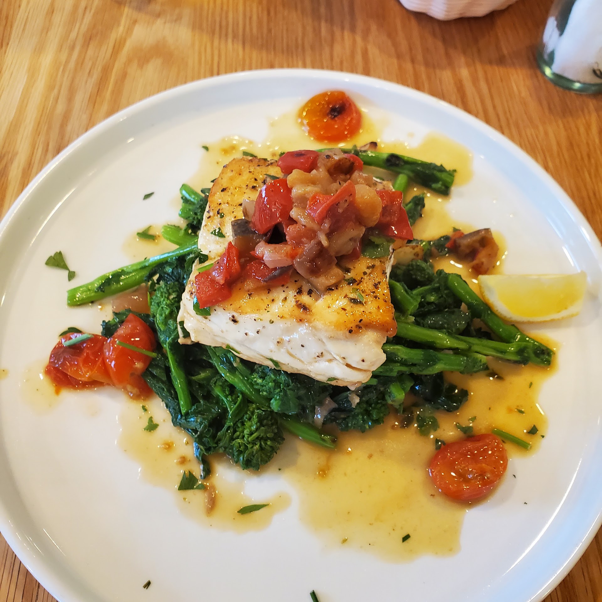 Overall Good experience. Pasta Fagiola Soup ( lots of tasty garlic slices ) and a tomatoes, cheese, veggies and olive salad were both very delicious. Halibut was cooked to the correct temp but it was kind of bland. Servers were excellent except one busser needs a little mgmnt - he took both sets of bread plates and utensil napkin rolls right as I sat down. Couldn't put the butter on my bread. My soup was delivered to my table- still no utensils or napkin. Had to get someone's attention and ask. Oddly, after my soup was finished- he came and cleared bowl and all 3 utensils before I could stop him...plus I wasnt sure if this was the standard for new utensils each course . My salad was then served on the table but again I had to get someone's attention for silverware in order to eat it. Actually became humorous! It is kind of a small dining area with the tables close together- so be ready for loud conversations within a foot to each side of you. The menu has lots of other excellent selections so definitely worth...