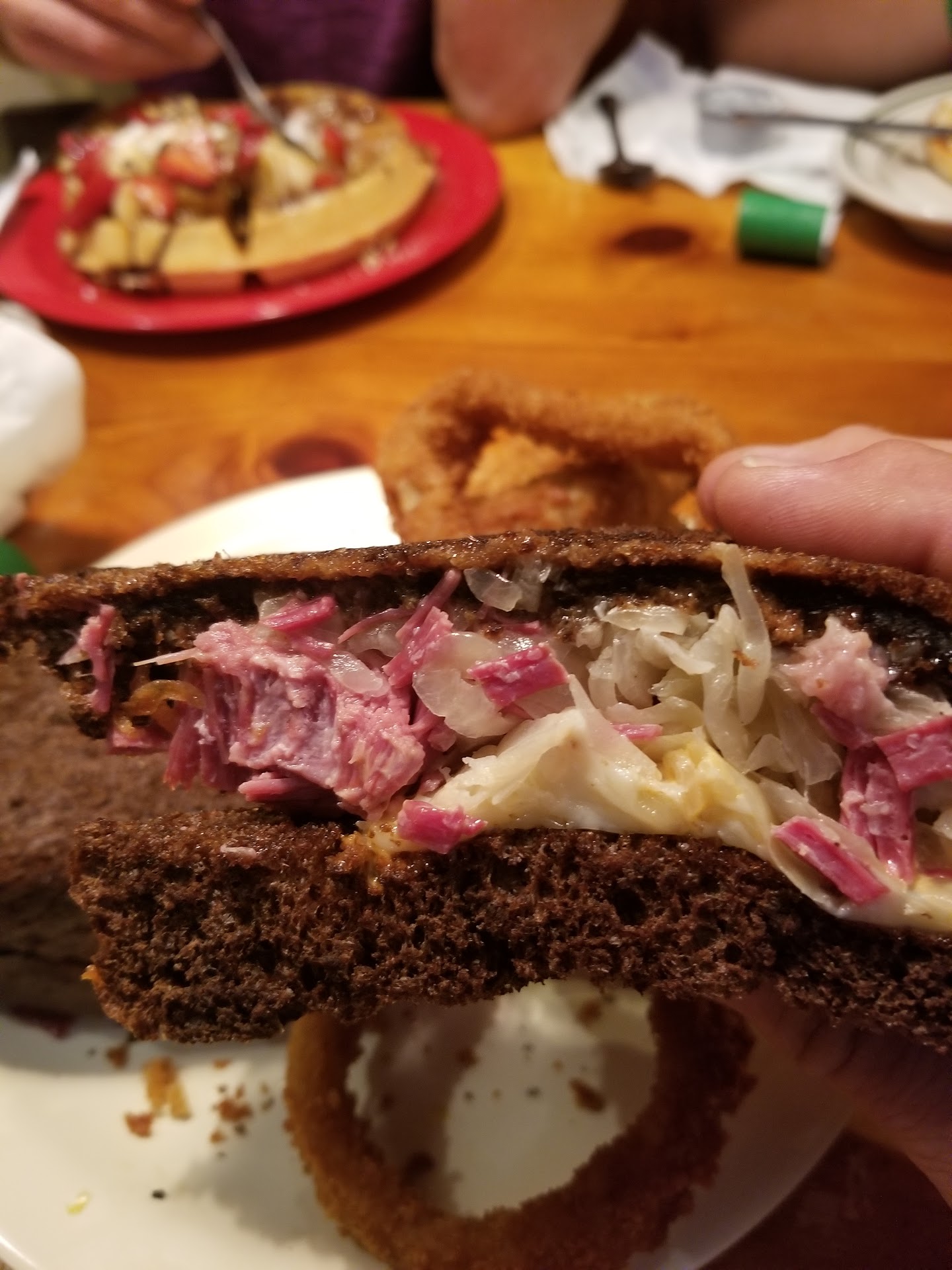 When we were finally asked what we wanted to eat, I chose blueberry pancakes with a side of extra crispy bacon, my dh chose the meatlovers omelet with hash browns and corn bread.