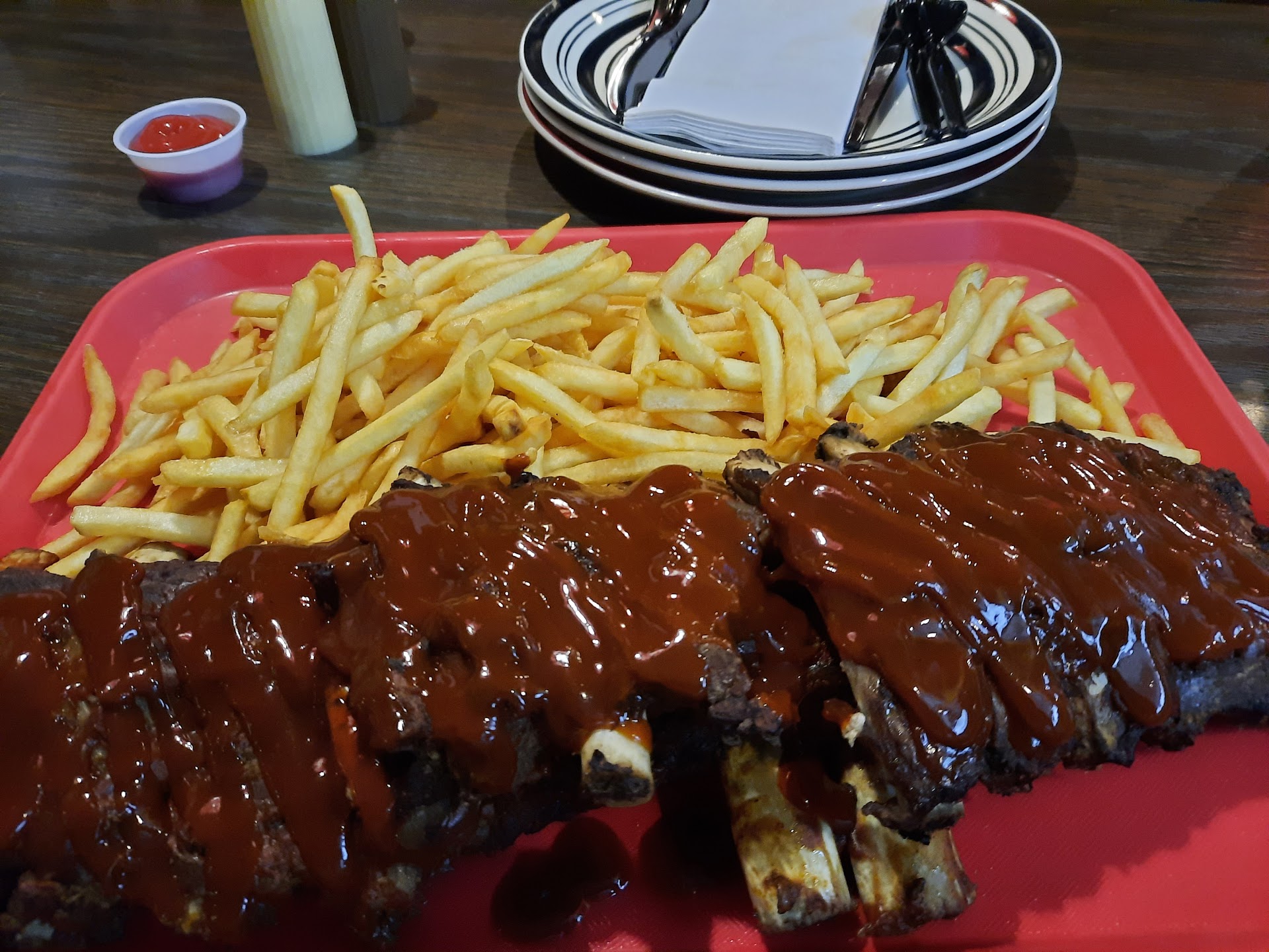 Read moreThe ribs and fries were a HUGE portion, and I felt cooked perfectly. My husband felt his were a little too done. Next time, I'll order without the sauce - I didn't care for it, but I'll add my own at home. My husband liked the sauce just fine. There was such a generous portions on the half rack that we will still be able to have a complete dinner another night. It was the first time we ordered from there, and it definitely won't...